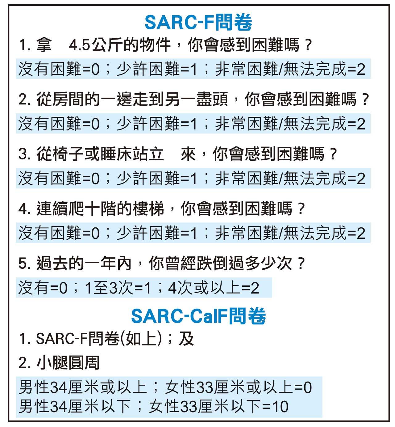 2. SARC-F問卷(力量、行走、起身、爬樓梯和跌倒)4分或以上;或