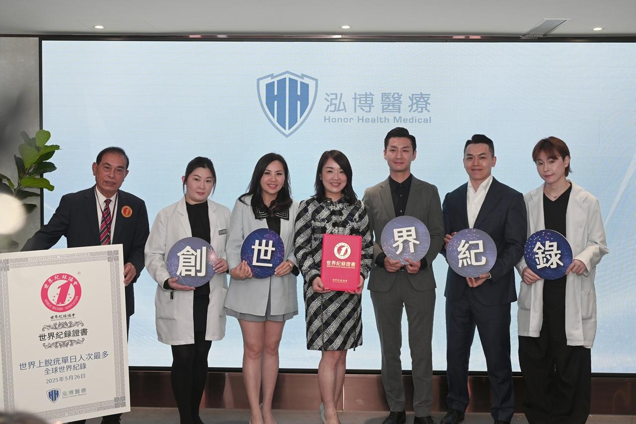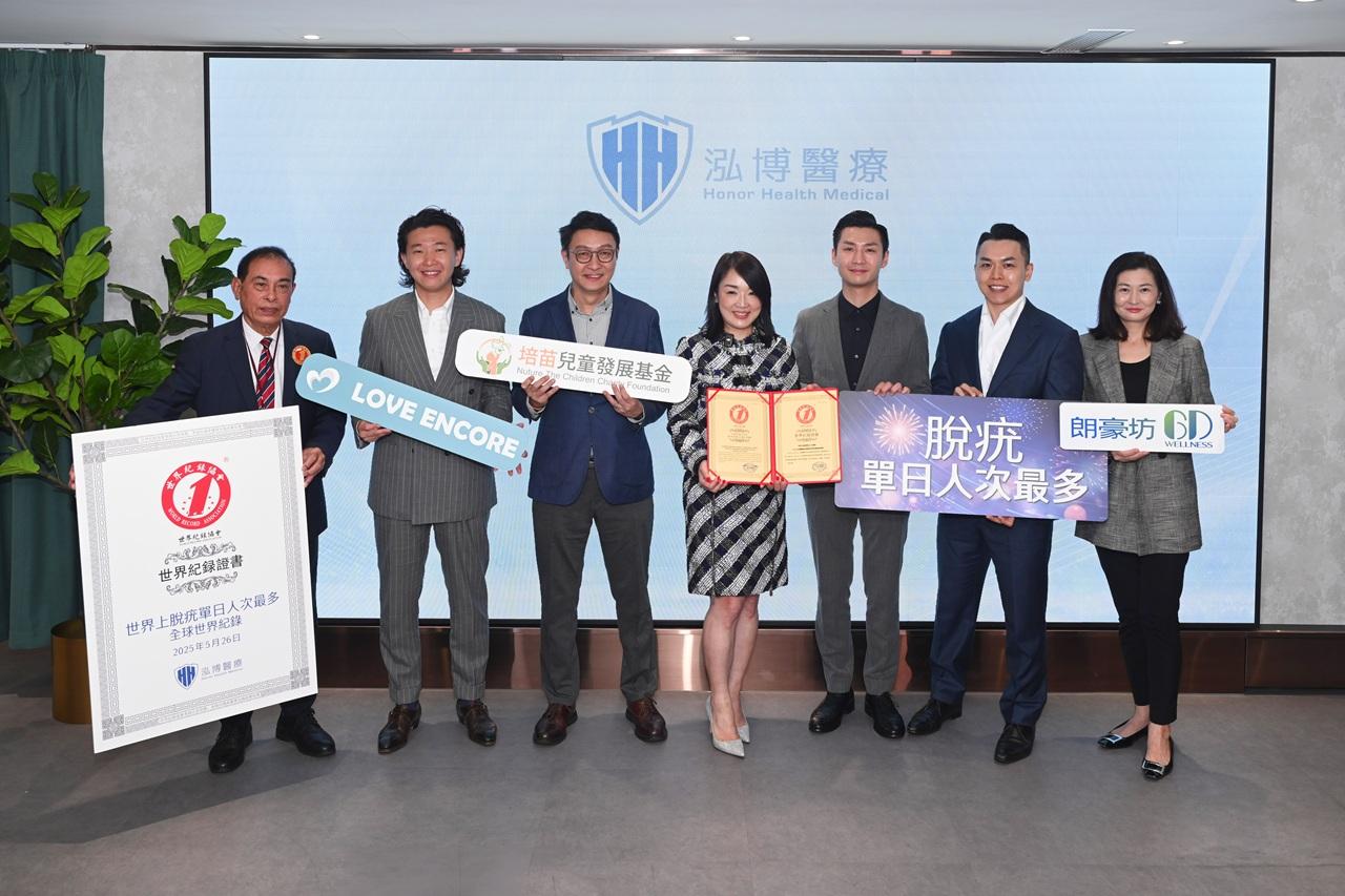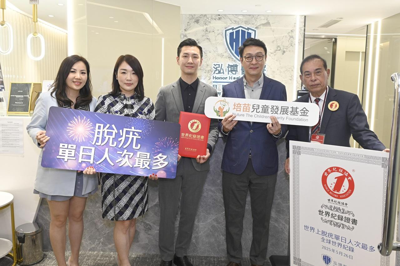 本港領先的醫療服務機構泓博醫療於2025年5月26日創下歷史性的一頁!由培苗兒童發展基金全力贊助,泓博醫療提供專業脫疣治療服務的「5・26慈善脫疣日」在世界紀錄協會認證下,於旺角朗豪坊成功創下「單日脫疣人次最多」世界紀錄,活動最終以164人完成,超越原定100人的目標。今次活動不但展現了醫療團隊的專業力量,同時傳遞健康與關懷,讓港人重拾自信與美麗。