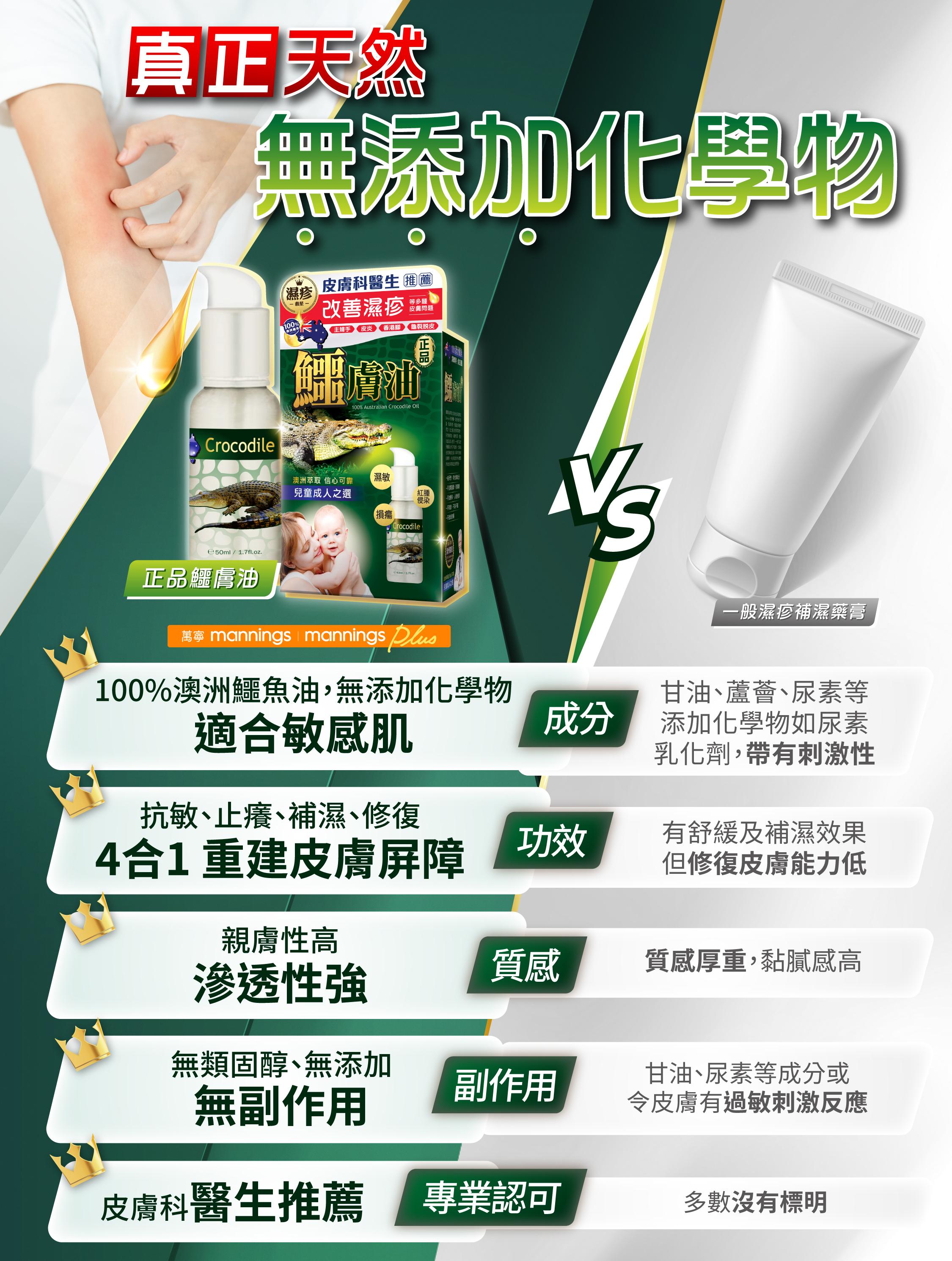 「正品鱷膚油」成分100%來自澳洲,並選用受規管養殖區達爾文(Darwin)灣鱷萃取,無添加類固醇及化學物,無副作用,嬰幼兒、成人適用,長期使用更可能肌膚變得健康潤澤。對比市面上其他濕疹軟膏,「「正品鱷膚油」親膚性高、滲透性強,有抗敏、止癢、補濕、修復4合1功效。而且有皮膚科醫生推薦,有效改善濕疹問題!