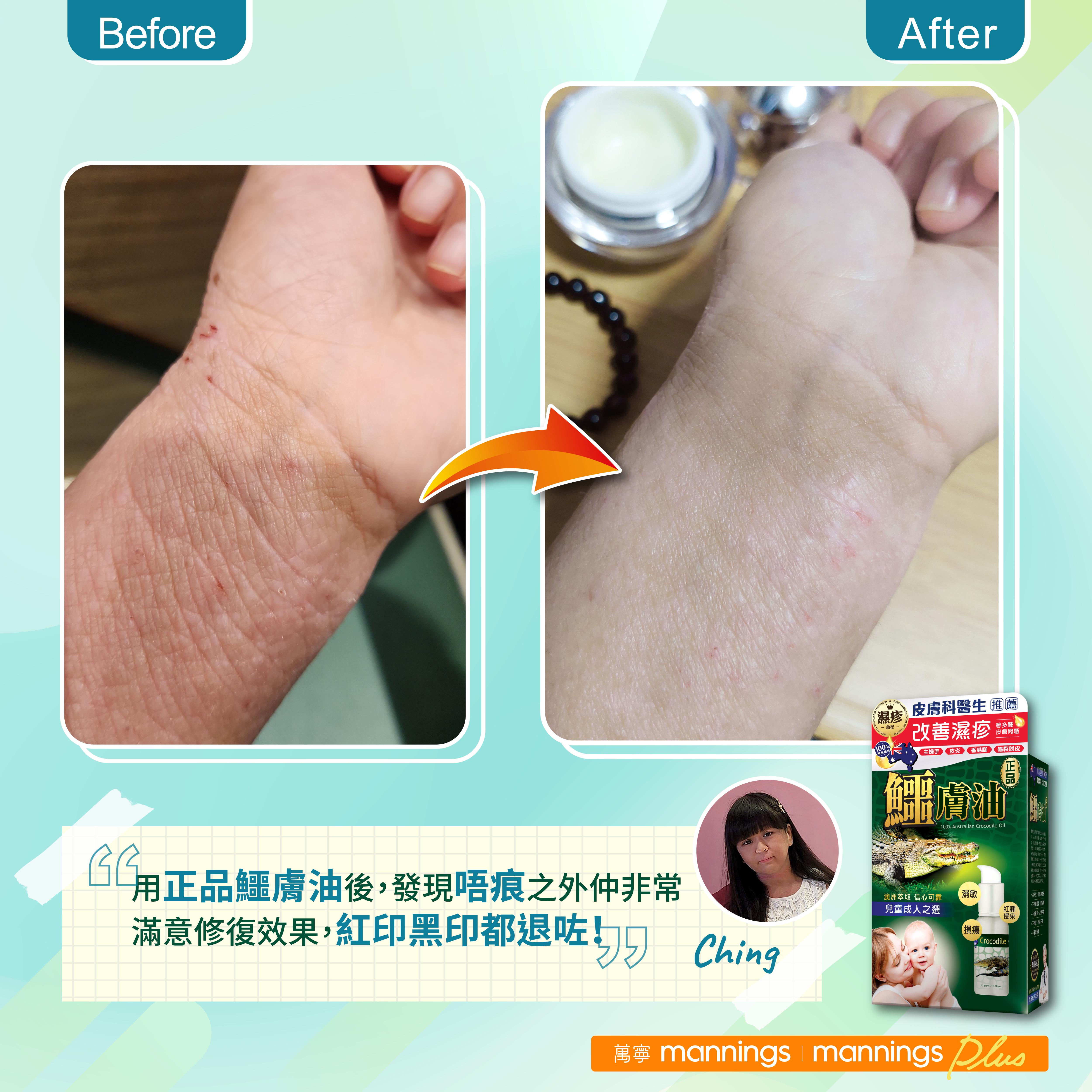 「濕疹位置集中在手腳,自從用正品鱷膚油後,手腳濕疹情況有顯著改善,發現唔痕之外仲非常滿意修復效果,紅印黑印都退咗!」