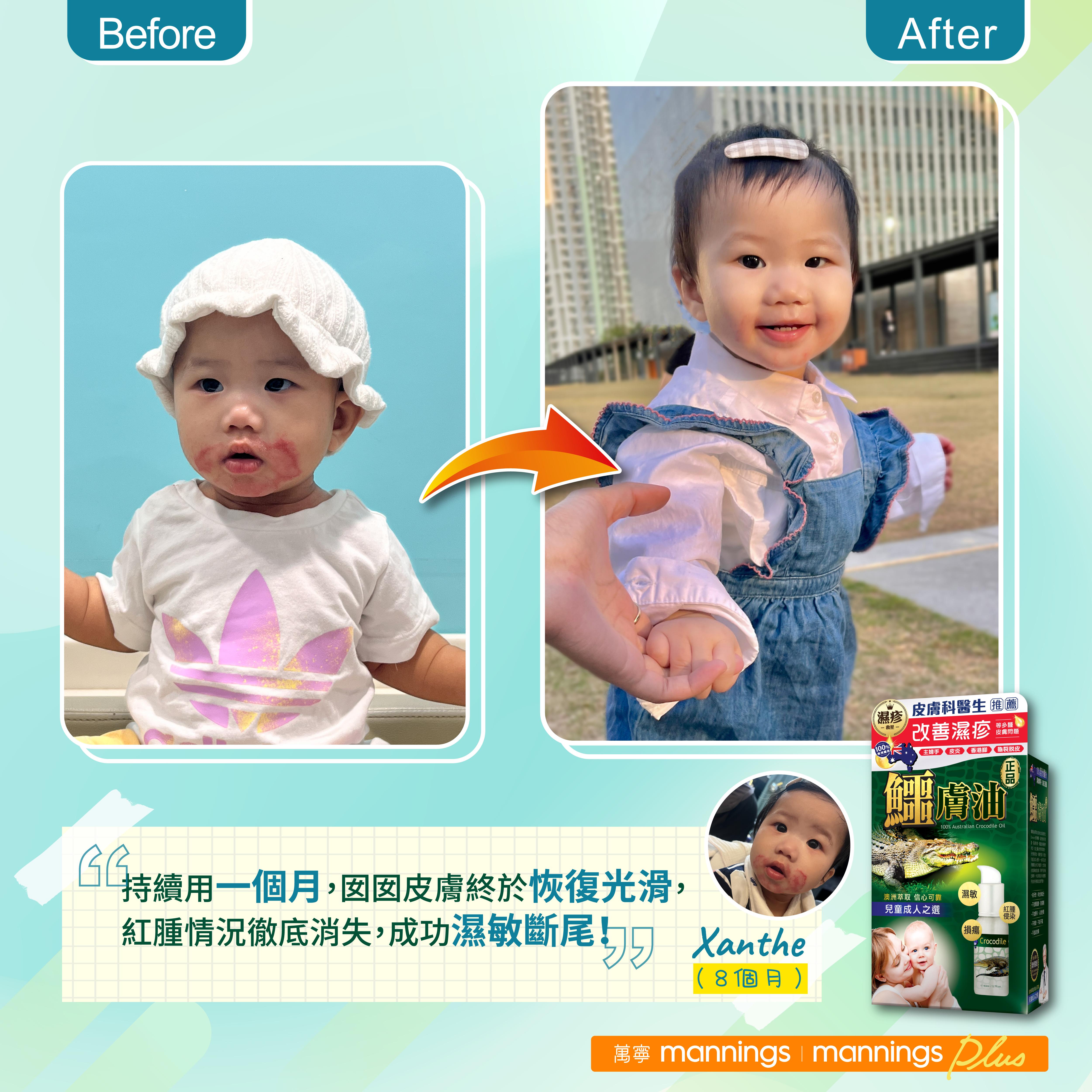 「Xanthe面部紅印越來越嚴重,但怕類固醇副作用大,影響囡囡皮膚變得脆弱敏感,所以嘗試塗抹有皮膚科醫生推介的『正品鱷膚油』,嘴部四周的大範圍紅腫逐一消退,持續用一個月,囡囡皮膚終於恢復光滑,紅腫情況徹底消失,成功濕疹斷尾!」