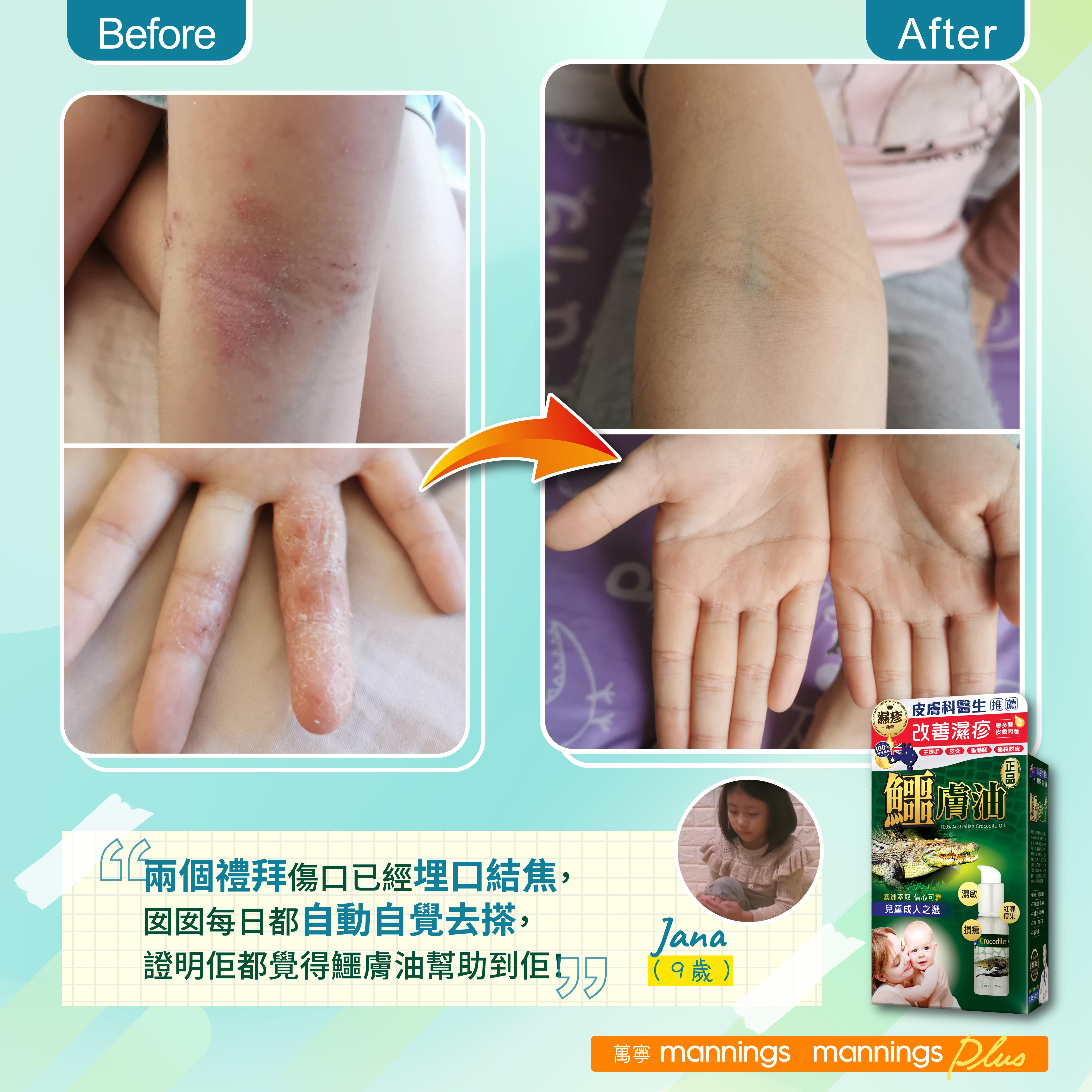 「囡囡最近濕疹復發,手肘、大髀、手指都紅到一撻撻,有時仲會搲到流血,夜晚瞓覺又會痕到瞓唔到!已經戒口唔食海鮮,早排天氣凍又無得沖熱水涼,見到佢咁辛苦我都好心痛!好在用咗『正品鱷膚油』,兩個禮拜傷口已經埋口結焦,最開心係囡囡每日都自動自覺去搽,證明佢都覺得鱷膚油幫助到佢!」