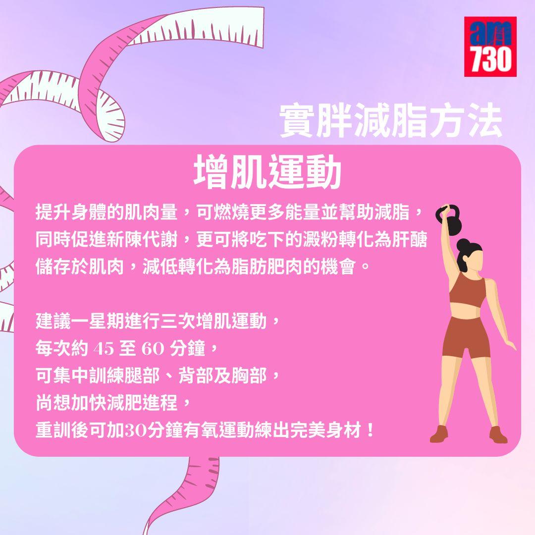 提升身體的肌肉量,可燃燒更多能量並幫助減脂,同時促進新陳代謝,更可將吃下的澱粉轉化為肝醣儲存於肌肉,減低轉化為脂肪肥肉的機會。建議一星期進行三次增肌運動,每次約 45 至 60 分鐘,可集中訓練腿部、背部及胸部,尚想加快減肥進程,重訓後可加30分鐘有氧運動練出完美身材!