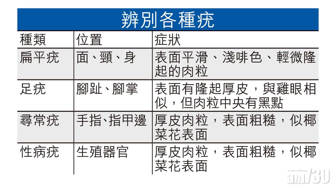 林嘉雯表示,疣由人類乳頭瘤病毒(HPV)引致,透過皮膚與黏膜組織互相接觸而產生厚皮、肉粒等症狀。不同的疣都長在特定位置,最常見的有4種,分別是扁平疣、足疣、尋常疣及性病疣(見附表)。