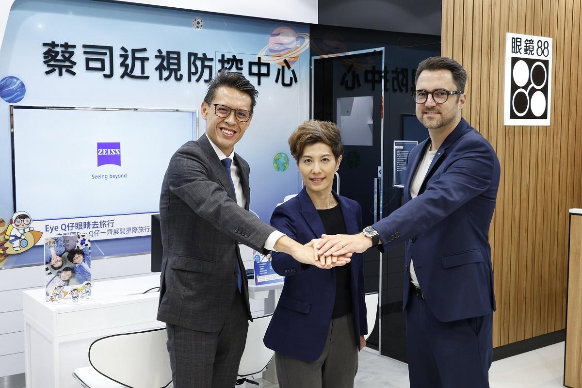 蔡司與眼鏡88過去10年合作無間,是次聯手打造全港首間「蔡司近視防控中心」亦是希望進一步提升近視管理理念,務求讓全港的小朋友得到良好的近視管理。(左起:蔡司香港視光護理副總裁章平達先生、眼鏡88集團高級商務總監蔡碧欣博士及Philipp Novak, Head of Global Brand Experience, ZEISS Vision Care, Carl Zeiss Vision International GmbH)