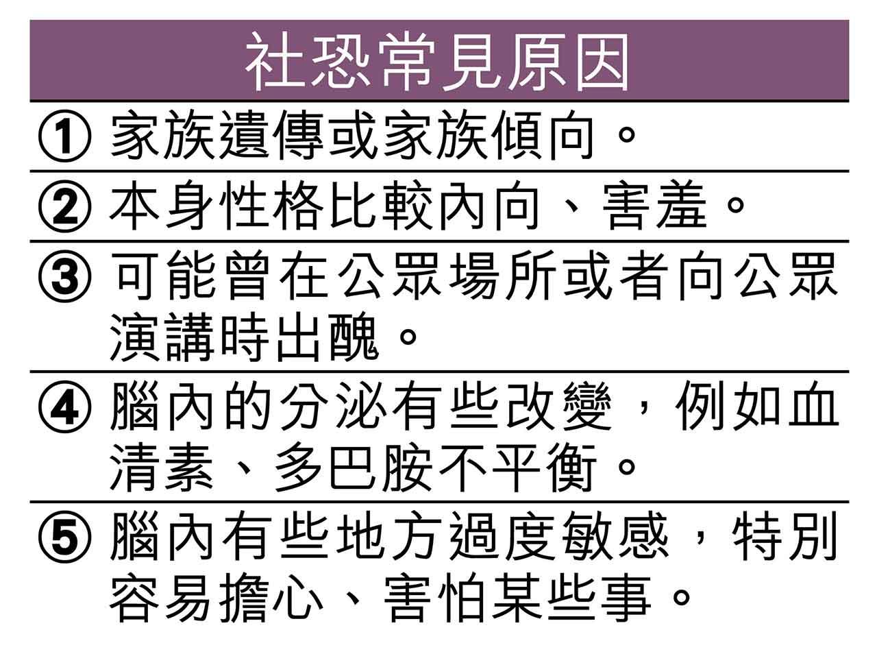 要注意的是,家人是否患有社恐,不能憑平日家中表現作判斷,「因為社恐患者在家人面前通常不會有明顯問題,他們未必覺得在家中吃飯是一種社交,但當要去不太相熟的親戚朋友家中吃飯、見面,比如約了下星期,可能他這星期已開始恐懼,心理上會逃避、慌張;肉體上則會出現心跳、面紅、出汗、頭暈、肚痛、手震等徵狀。」萬一患者被迫去到現場,情況可能會更嚴重,例如「口震震」,話也說不出一句,不停想去洗手間,腦裡一片空白,甚至出現面部麻痺。