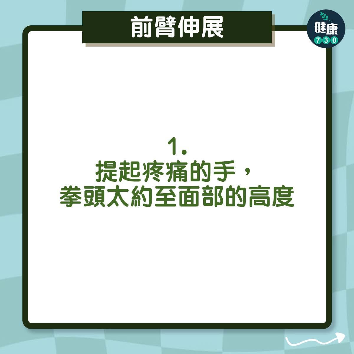 - 另一隻手捉住拳頭保持痛手手腕屈曲,痛手再往前伸直,直至有拉扯感。
