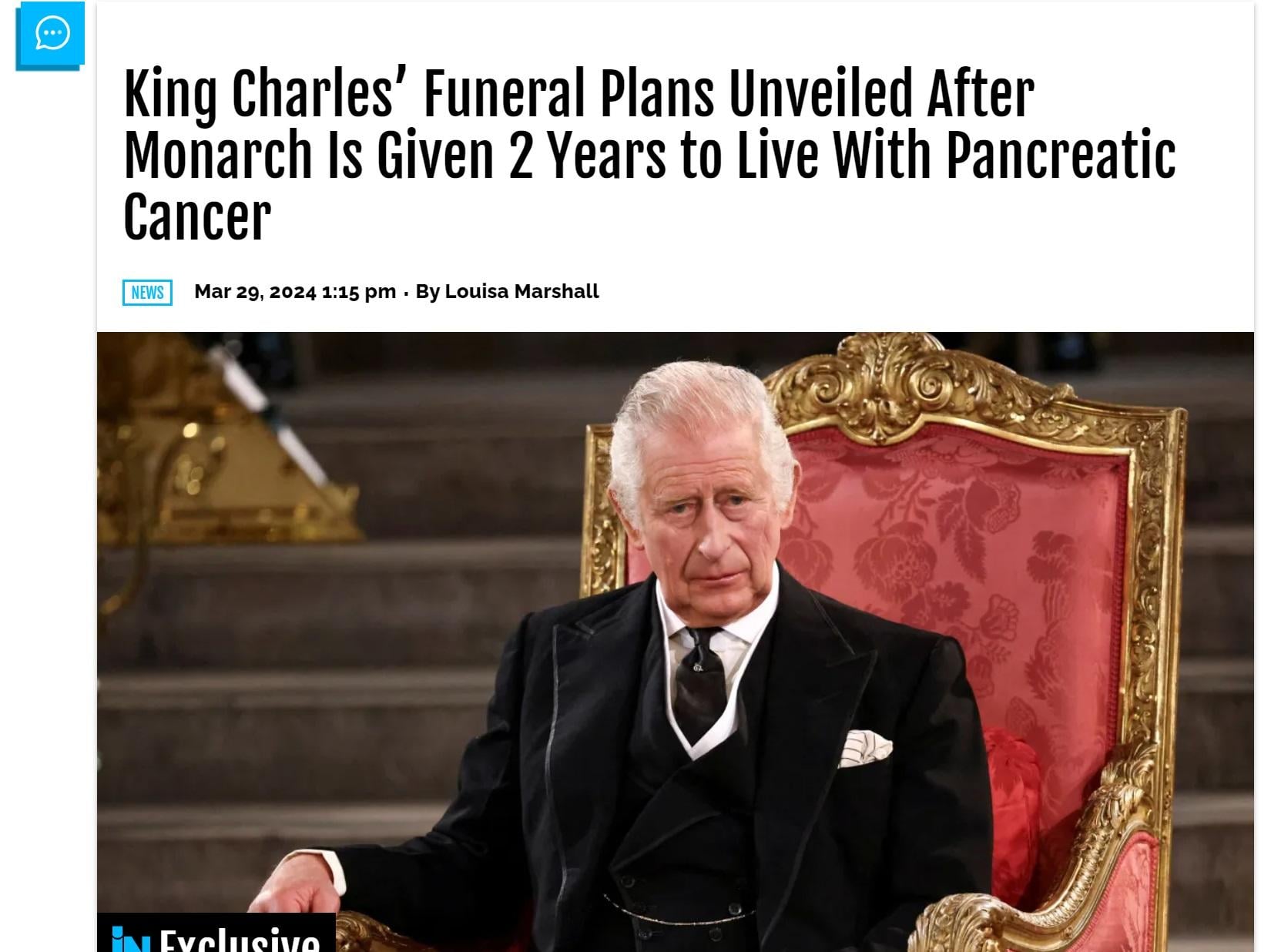 外媒指,英王查理斯三世患的是胰臟癌,很可能只剩下兩年生命。(網上截圖)