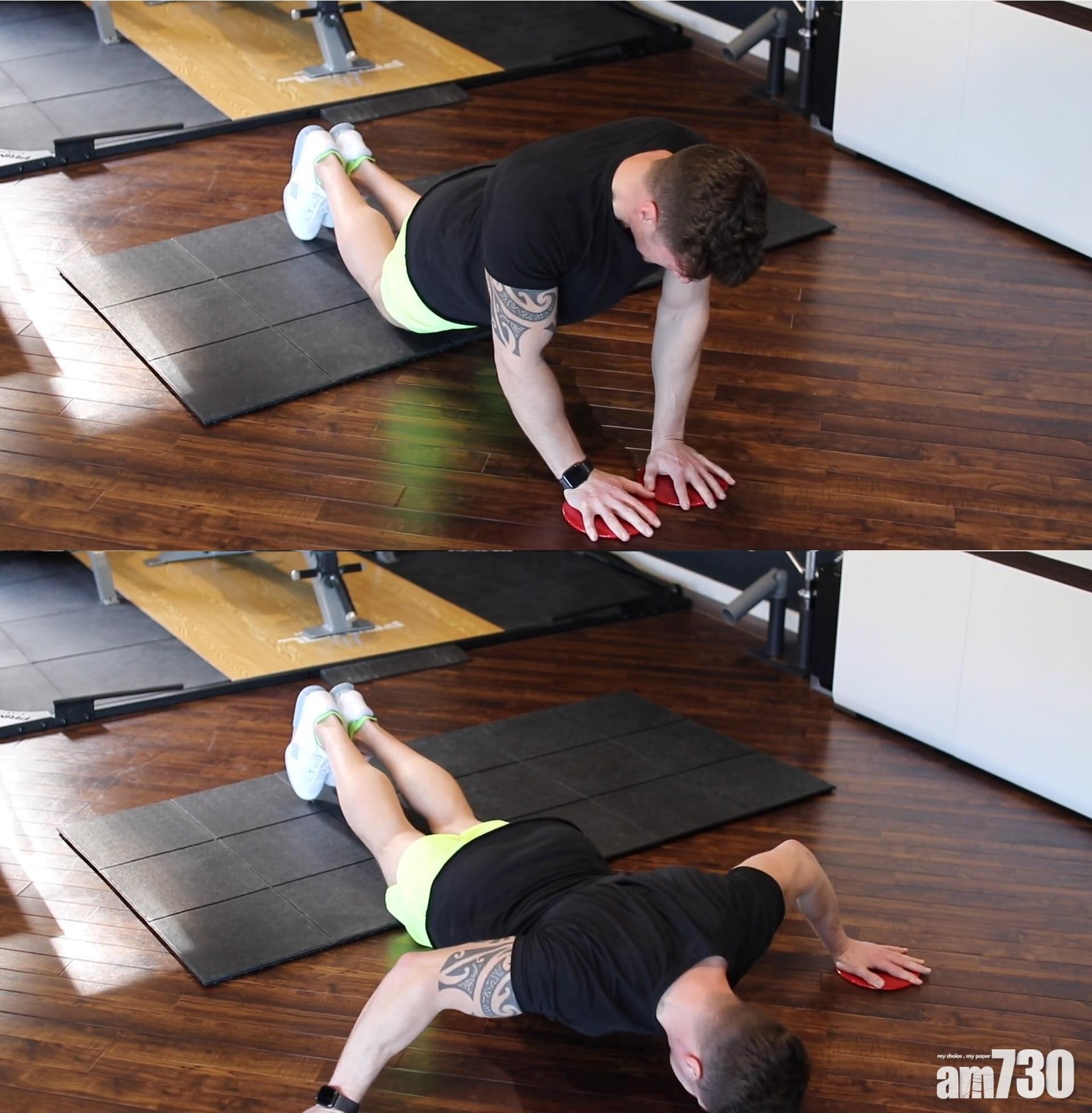 - 如做初階掌上壓般,以手和膝蓋支撐身體,不過手掌下墊兩塊布減低摩擦力。而同時挺胸收腹,收起肩胛骨和保持身軀與大腿成一直線。