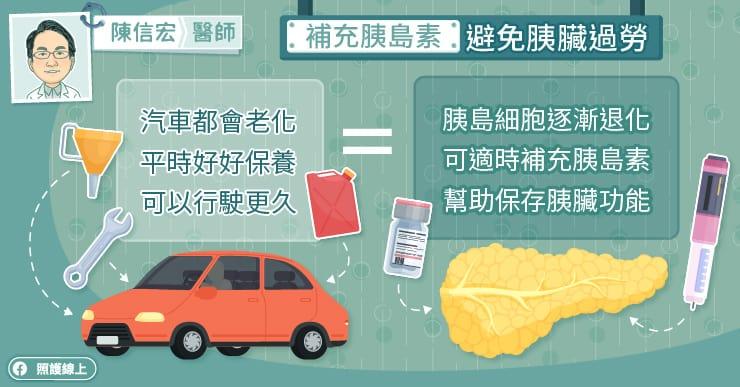 「補充胰島素就像我們在保養汽車,汽車零件老化後就比較容易故障,不過如果平時有好好保養,還是可以開很久。」陳信宏醫生說,「我都會告訴糖友,打胰島素有幾個好處,一個是有效控制血糖,避免產生慢性併發症;一個是讓胰臟細胞休息,才有機會繼續運作。」