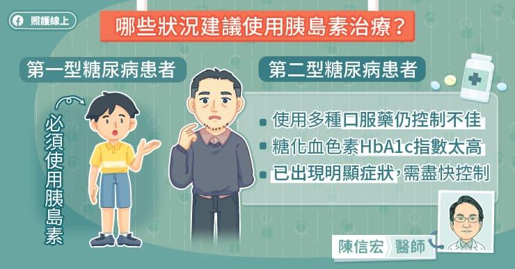 胰島素是人體必需的內分泌,陳信宏醫生說,第一型糖尿病患者一定需要使用胰島素,至於第二型糖尿病患者,在幾個狀況下會建議使用胰島素補充。