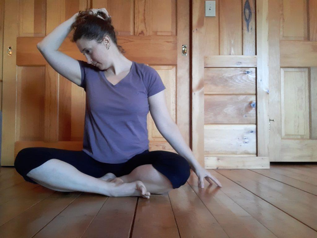 - 吸氣,拉長脊柱,然後呼氣,將軀幹向右旋轉,凝視右肩。向另一側重複動作。