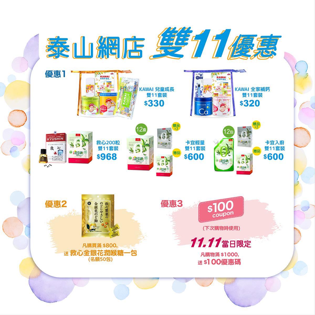 泰山網店現正進行限時優惠,除了推出5款超抵健康套裝,包括老少皆宜的KAWAI肝油丸、益氣強心的日本人字牌救心,還有天然健康的Karori卡宜甜菊糖;買滿$800送秋燥天氣必備的救心金銀花潤喉糖一包;1111當日買滿$1,000再加送$100電子優惠券於下次購物時使用。優惠期至1113日,萬勿錯過!