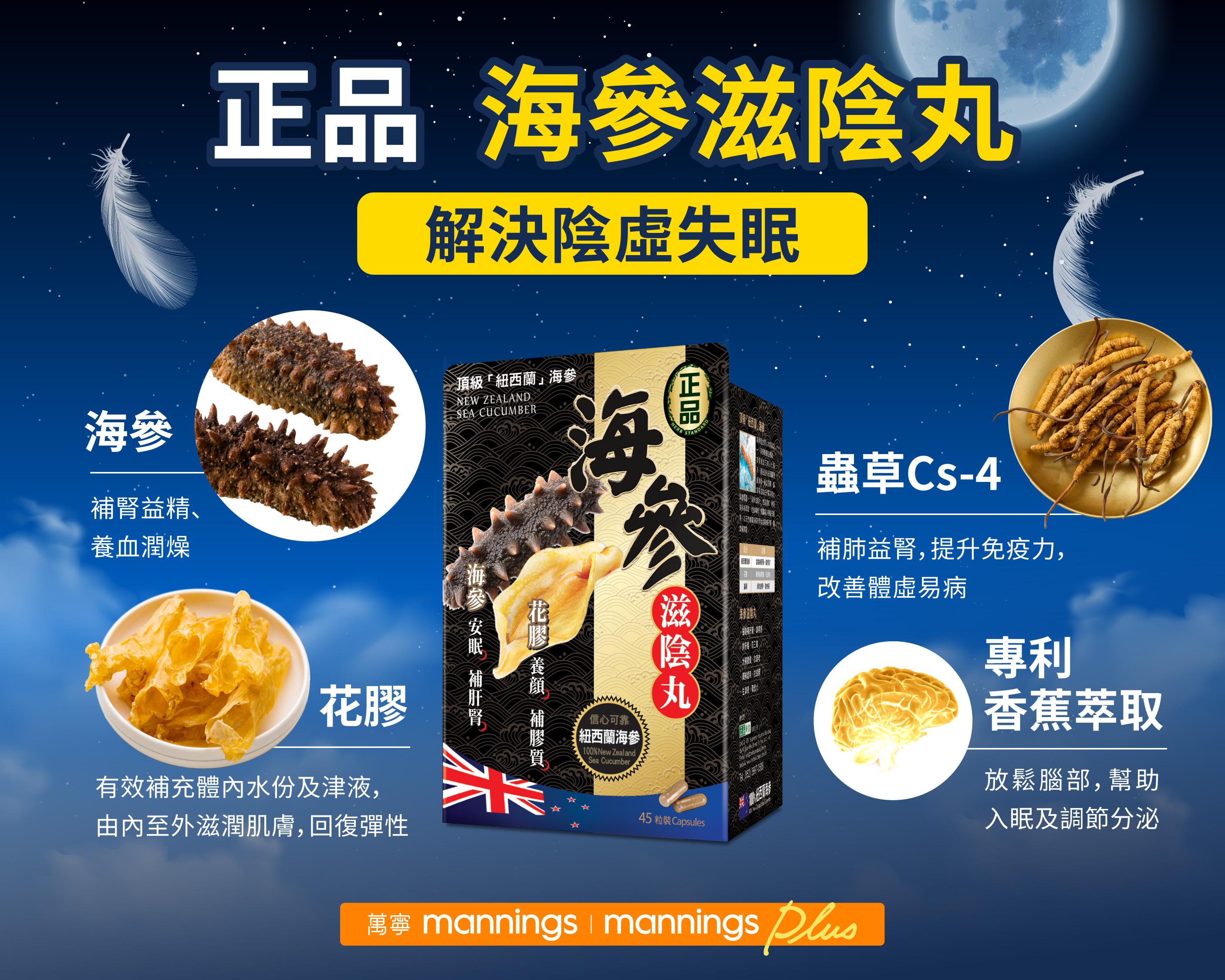 採用100%紐西蘭海參製造,有效滋陰潤燥、補肝腎和補膠質。海參貴為「海中人參」,滋而不膩,補而不燥,能滋陰補肝腎,對陰虛失眠有顯著療效。而花膠含有豐富膠原蛋白和骨膠原,有效補充體內津液,滋潤肌膚及提升彈性。除外,當中特別添加了蟲草Cs-4成分,能夠增強免疫力、消除疲勞,改善體虛易病的情況。同時其採用國際專利香蕉萃取成分,能幫助放鬆神經,提升睡眠質量,促進身體細胞再生,從而改善膚質。