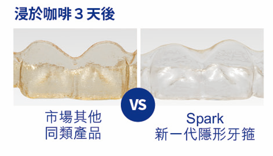 由於所用的材料及技術更為優勝,Spark新一代隱形牙箍不單比其他品牌更透亮清晰,戴上後就算露齒笑亦不易被發現。而且每個牙箍都經人手打磨,周邊更平滑,感覺更舒適,不易刮傷口腔。另外牙箍有極強抗漬能力,就算有需要戴著飲茶或咖啡等,也不會輕易染色。