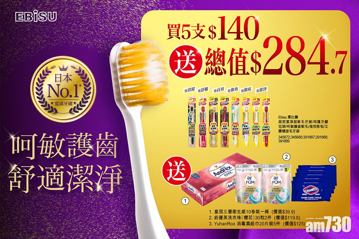 優惠:購買任何指定EBiSU惠比壽寬頭牙刷5支滿$140, 即可獲贈皇冠三層衛生紙10卷裝一條 (價值$39.9) 再加送紡優美洗衣珠(櫻花)30粒2件(價值$119.8) 及YuhanRox 消毒濕紙巾20片裝5件(價值$125) (總值$284.7)