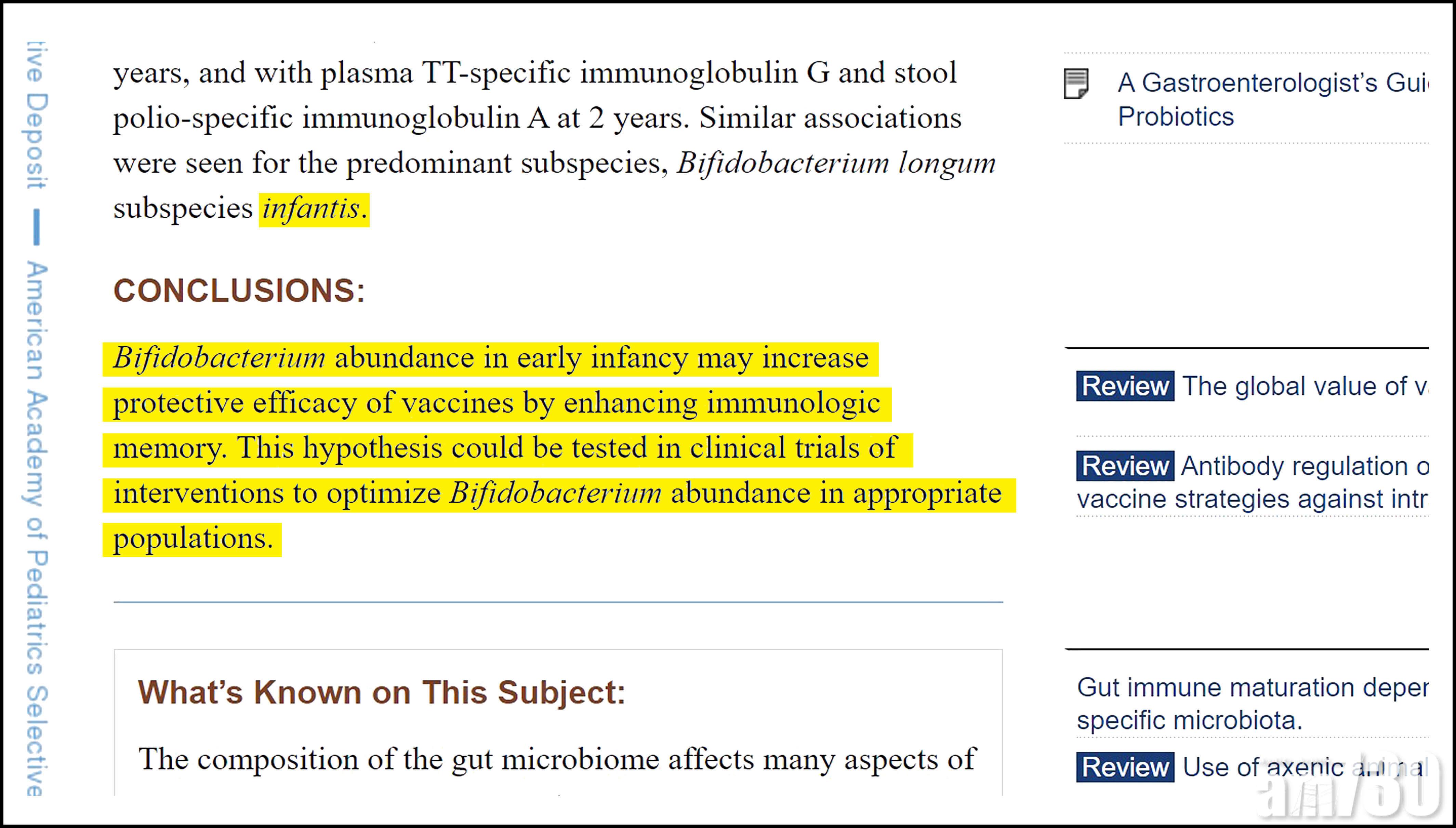嬰兒型雙歧桿菌是初生嬰兒腸道內最重要的益菌,主宰著免疫力的發展,擁有強效活性,安全性較其他益菌更高。《美國兒科醫學期刊》發表一項對嬰幼兒的臨床研究,發現體內嬰兒型雙歧桿菌較多的組別,較能有效辨別病原,持續有系統地建立抗體及其數量,提升疫苗的效能。該菌的數量愈多,免疫細胞的記憶力愈強,抗病成效愈高。
