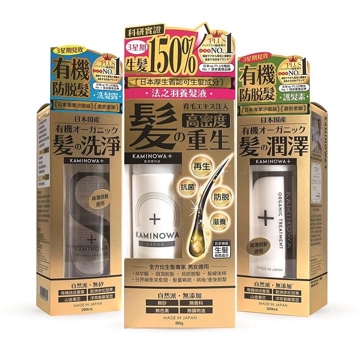 左: KAMINOWA法之羽有機防脫髮洗髮露 200mL (標準價$289) 中: KAMINOWA法之羽養髮液 80g (標準價$769) 右: KAMINOWA法之羽有機防脫髮護髮素200mL (標準價$289) 日本製造