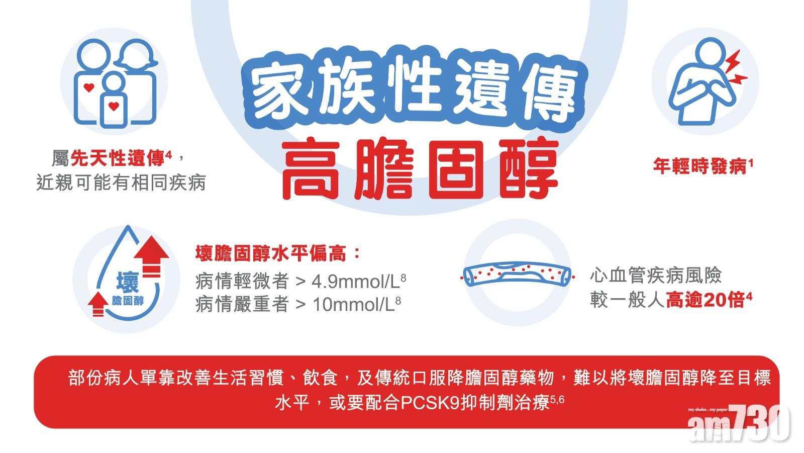 他又表示,家族性遺傳高膽固醇患者出現併發症的年齡,通常比一般高膽固醇病人早,部分患者早於20多歲便出現心腦血管病6。整體來說,他們患心血管病的風險比一般人高約20倍1。