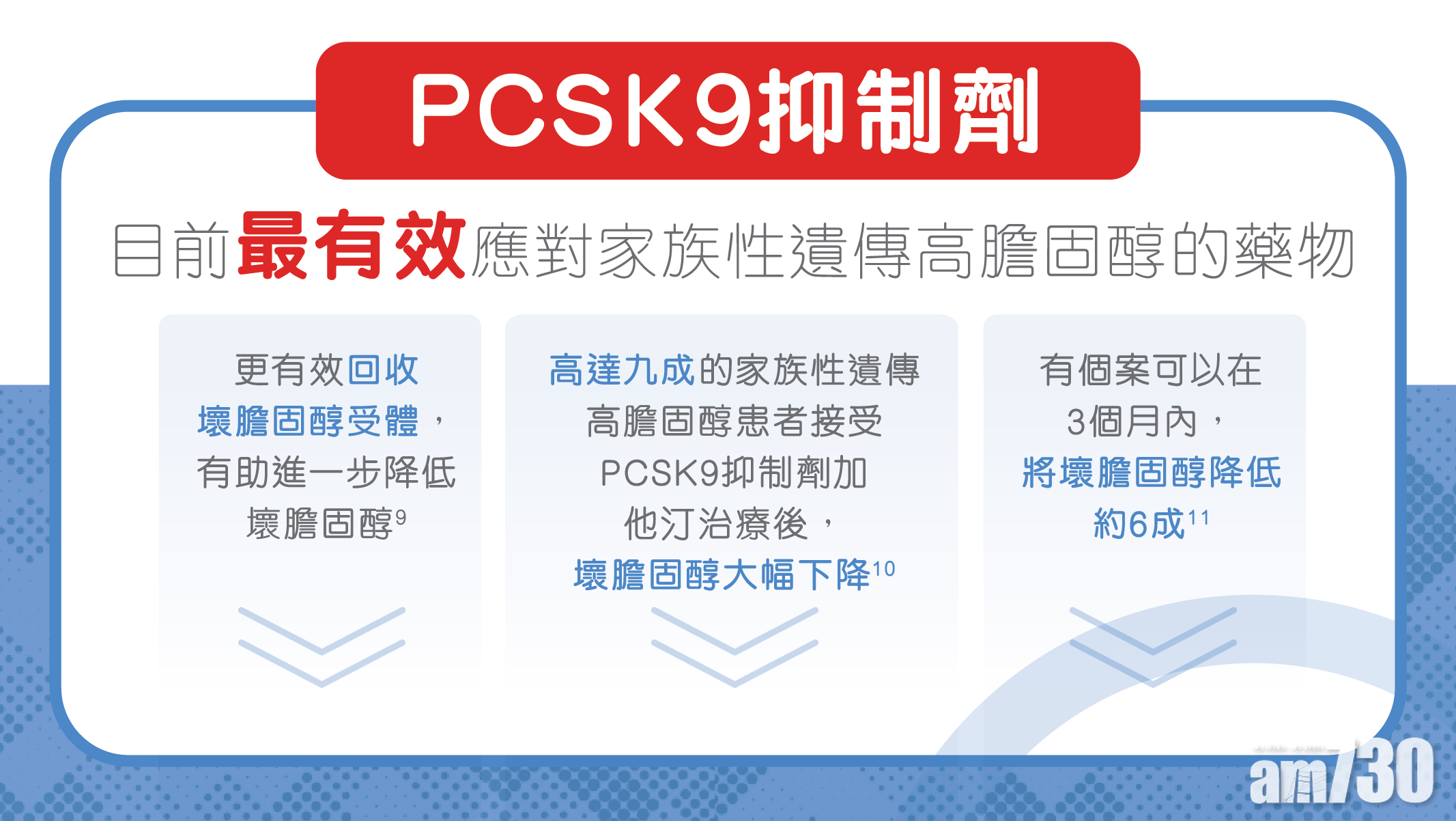 近年開始使用的PCSK9抑制劑,對治療家族性遺傳高膽固醇的效果顯著。「PCSK9抑制劑令身體回收壞膽固醇的受體,有助進一步降低壞膽固醇9。研究顯示,高達九成的家族性遺傳高膽固醇患者接受PCSK9抑制劑加他汀治療後,壞膽固醇大幅下降10。有個案可以在三個月內,將壞膽固醇降低約六成11。」陳醫生表示。