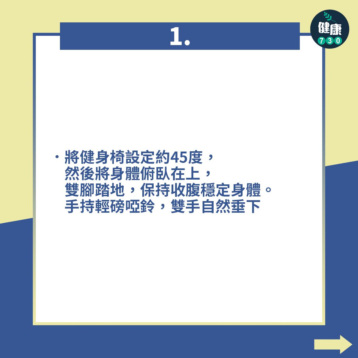 - 將健身椅設定約45度,然後側臥在上,身體下方的手可夾住健身椅幫助平衡,保持收腹穩定身體。身體上方的手持輕磅啞鈴,在身前垂下。