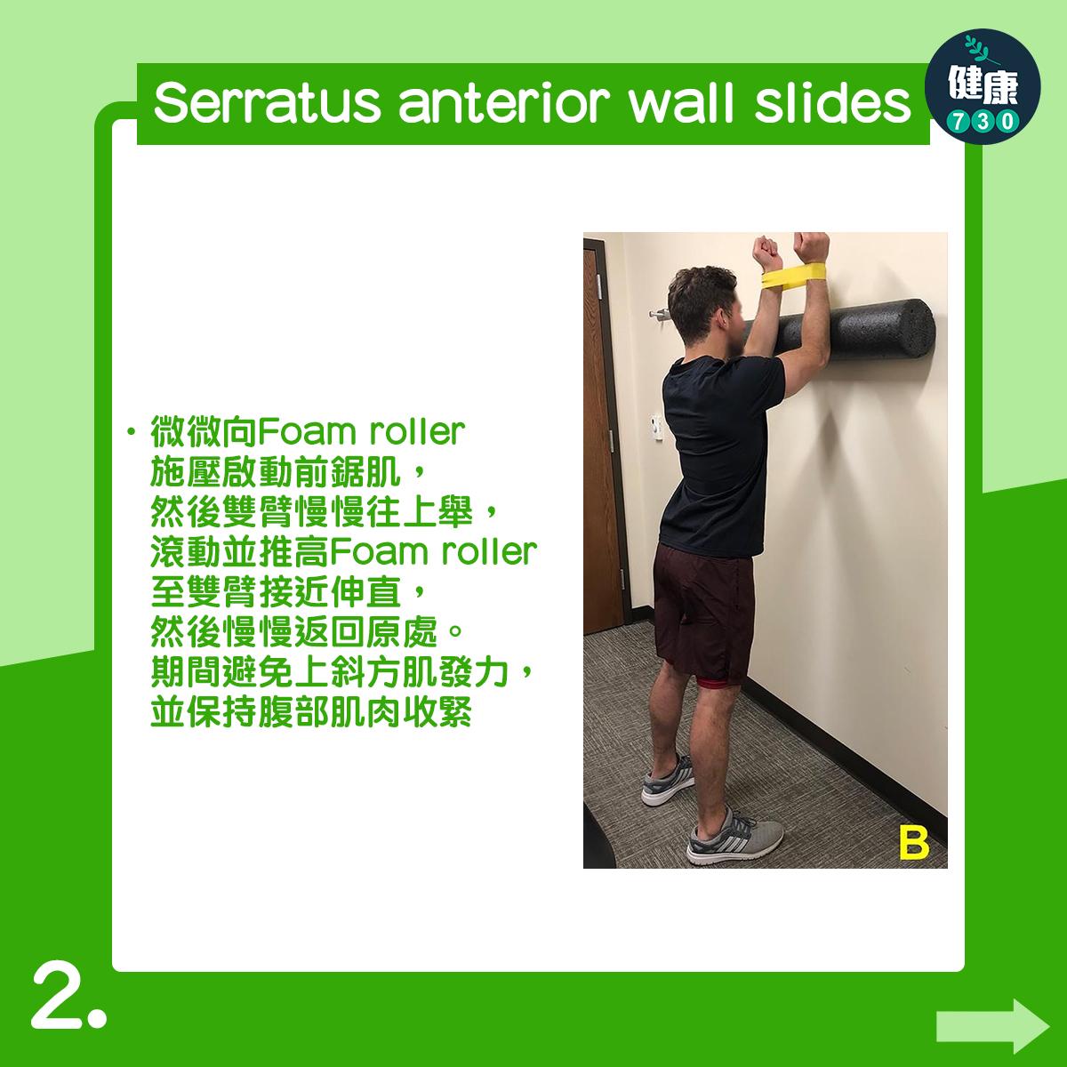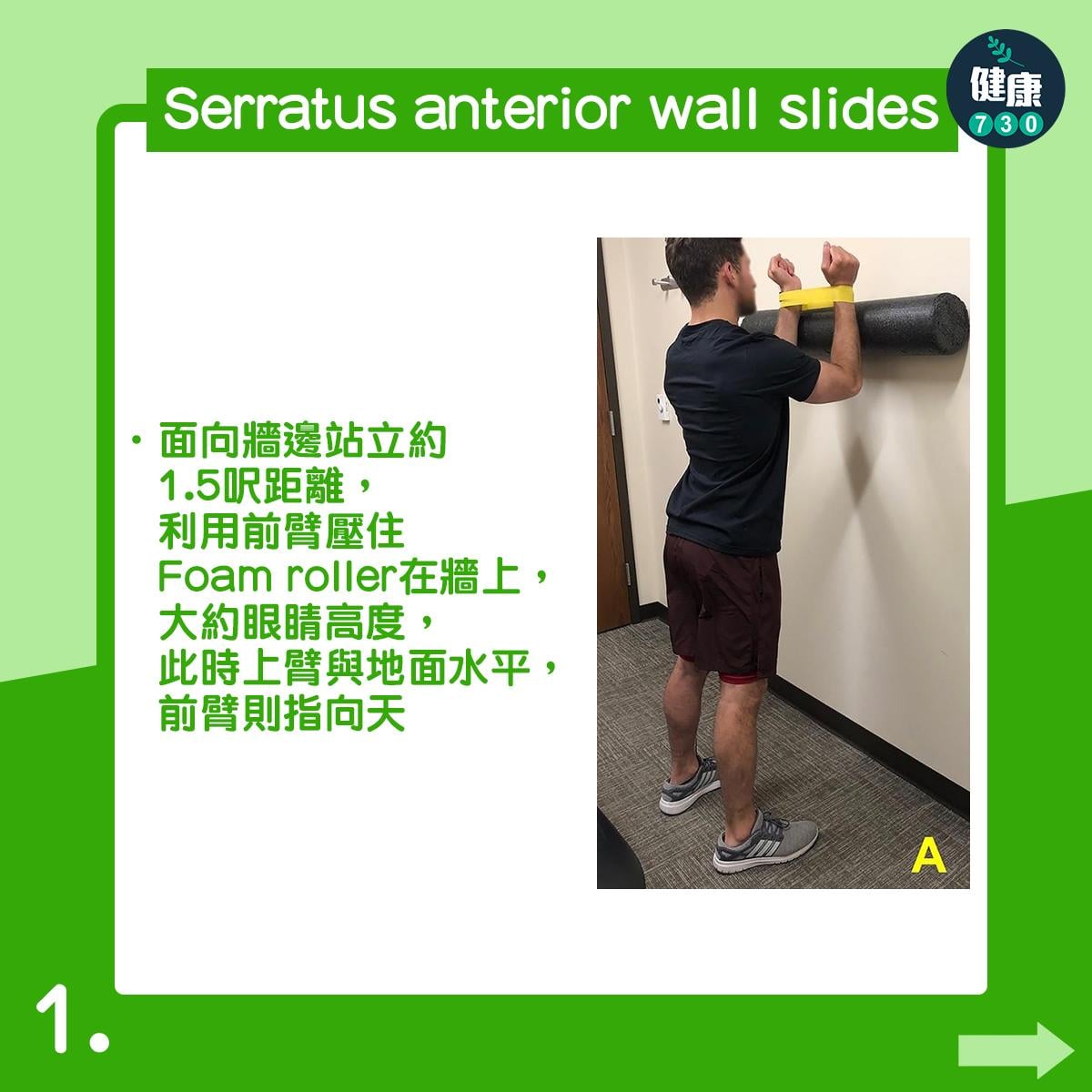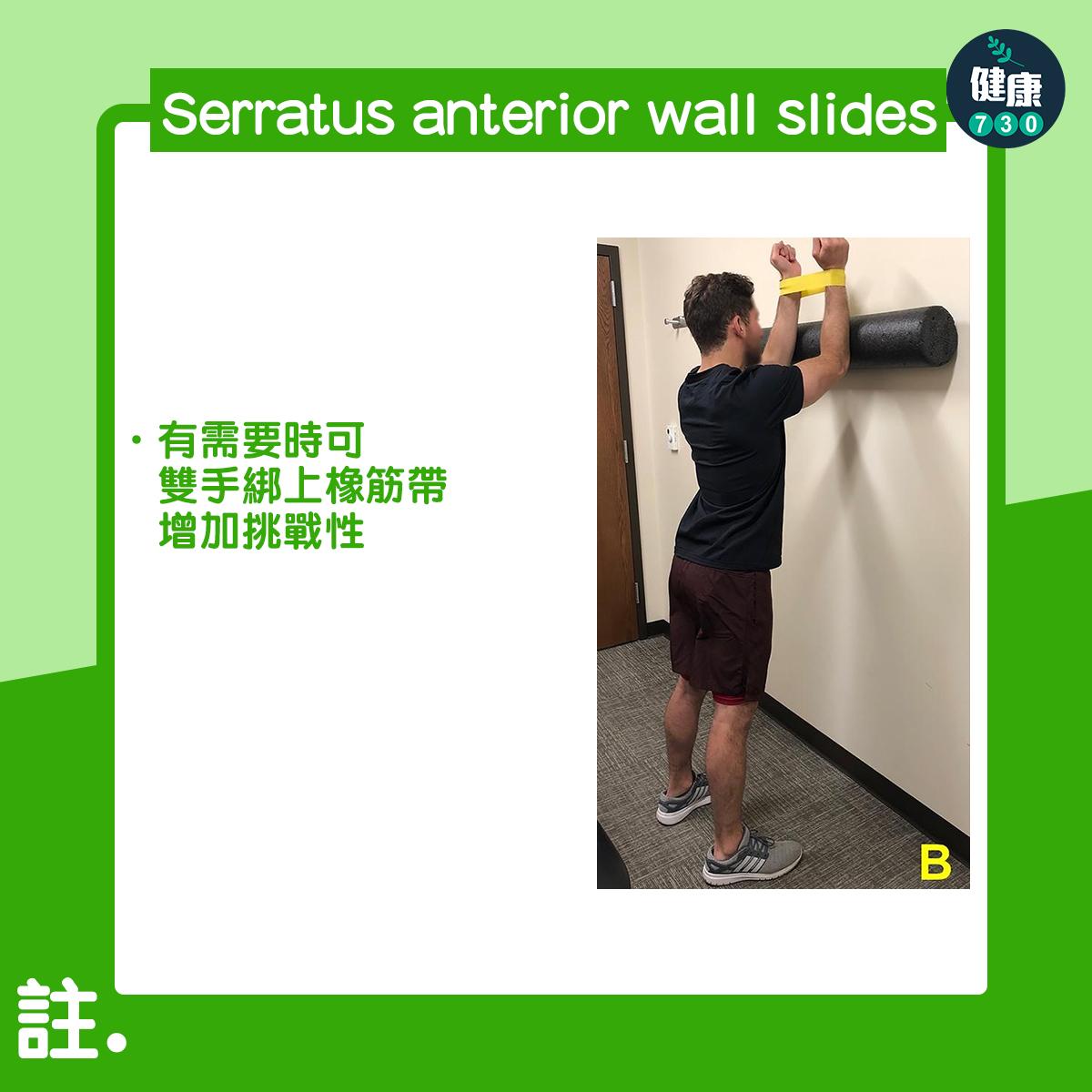 其實前鋸肌的作用是控制肩胛骨活動,上和中部分負責將肩胛骨向身體兩側拉,如向前出拳時可將手臂再往前伸一點;而肌肉下方部分則負責肩胛骨向外旋轉,當雙臂往頭頂提高時就需要幫忙。如果前鋸肌太弱,肩胛骨就不會貼伏於背部,形成一隻「翼」,有可能減低肩關節的穩定性,造成肩夾擊等關節痛的問題。要強化前鋸肌,可以做以下動作。