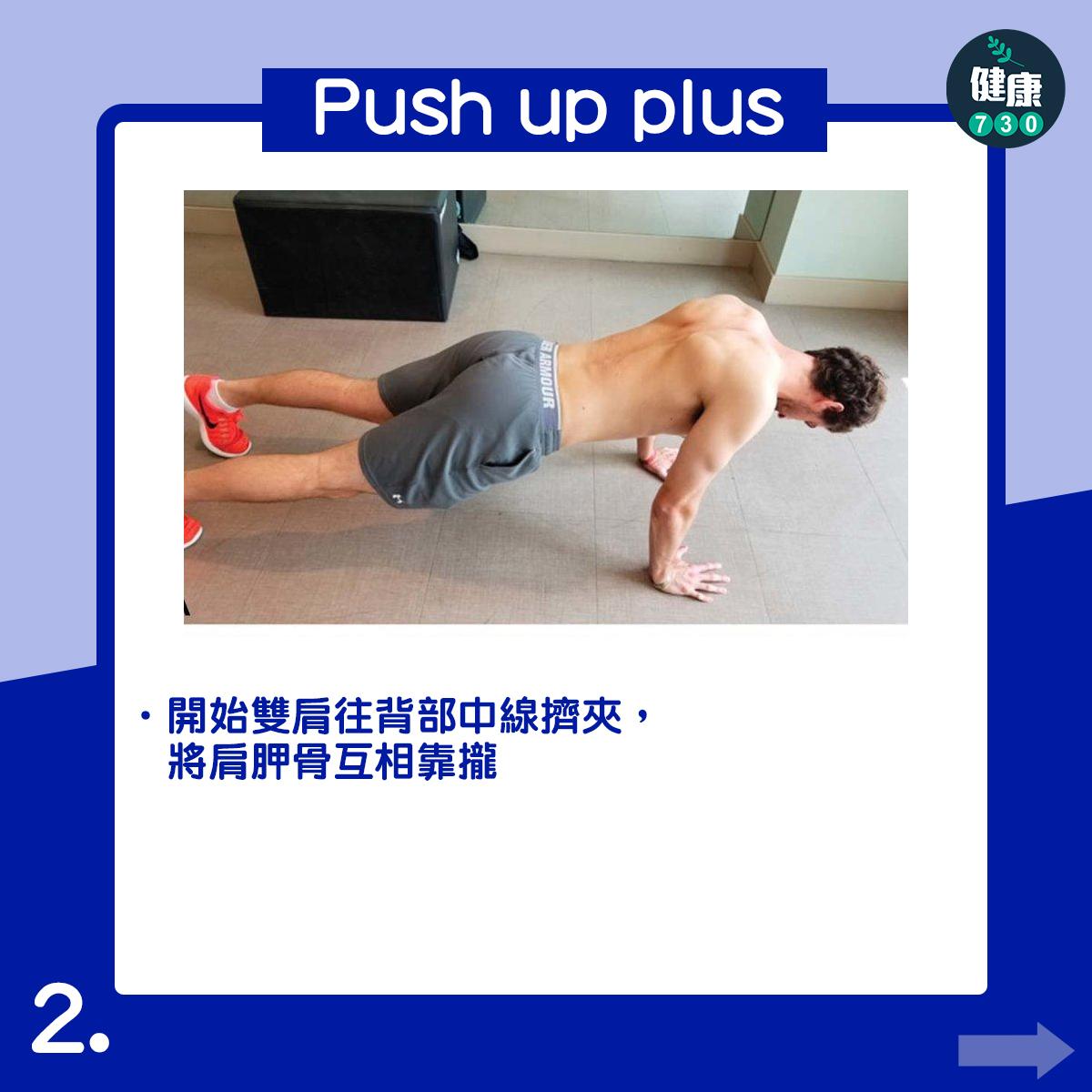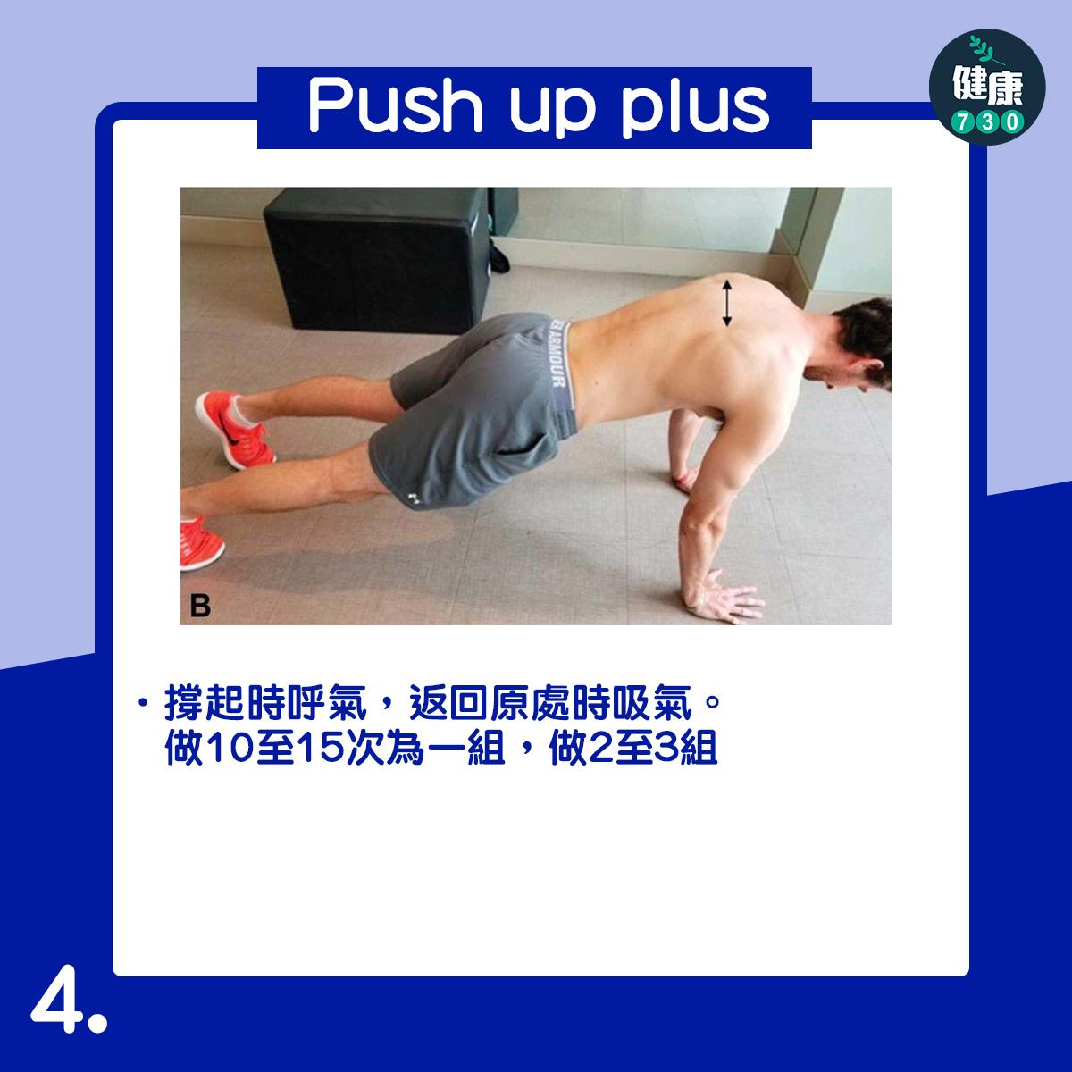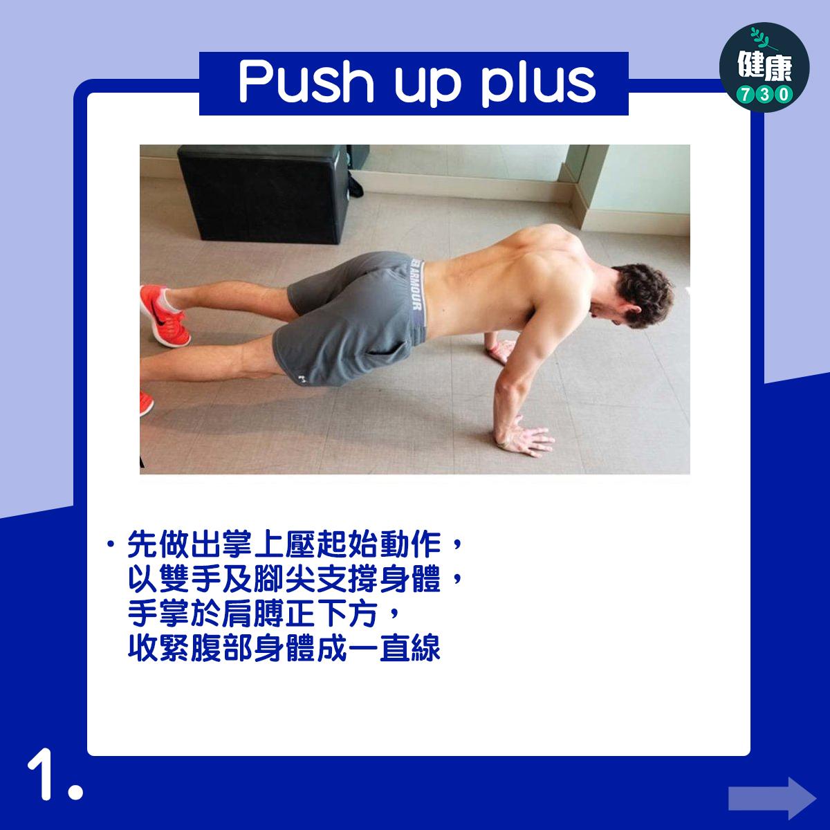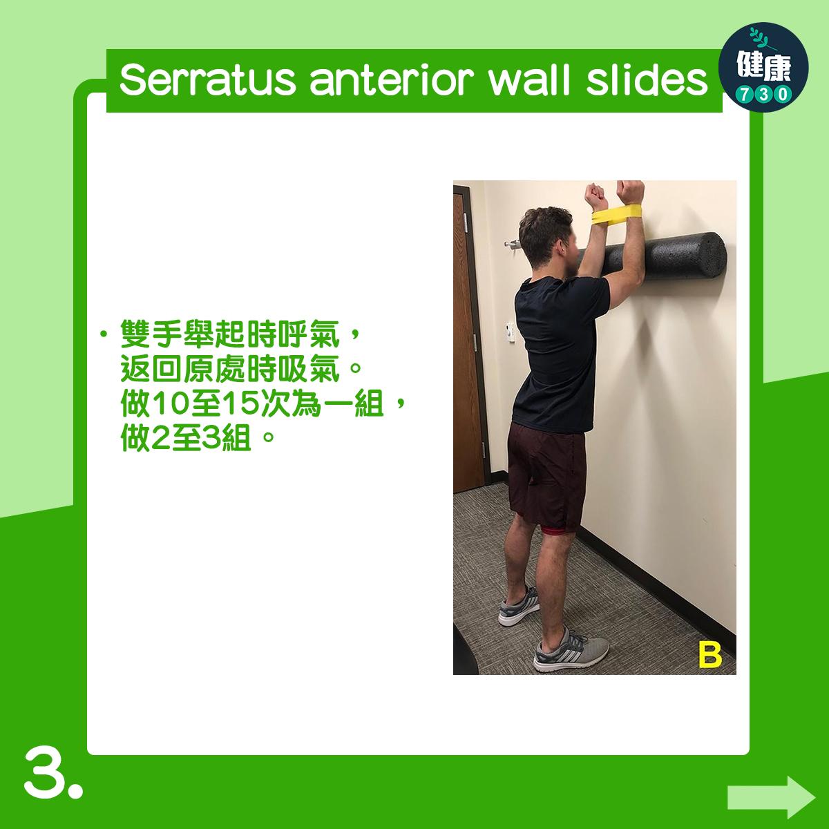 其實前鋸肌的作用是控制肩胛骨活動,上和中部分負責將肩胛骨向身體兩側拉,如向前出拳時可將手臂再往前伸一點;而肌肉下方部分則負責肩胛骨向外旋轉,當雙臂往頭頂提高時就需要幫忙。如果前鋸肌太弱,肩胛骨就不會貼伏於背部,形成一隻「翼」,有可能減低肩關節的穩定性,造成肩夾擊等關節痛的問題。要強化前鋸肌,可以做以下動作。