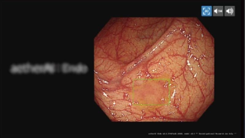「即時大腸鏡息肉自動偵測」能即時自動偵測大腸鏡息肉,將病灶位置清楚框選出,並有聲音警示。
