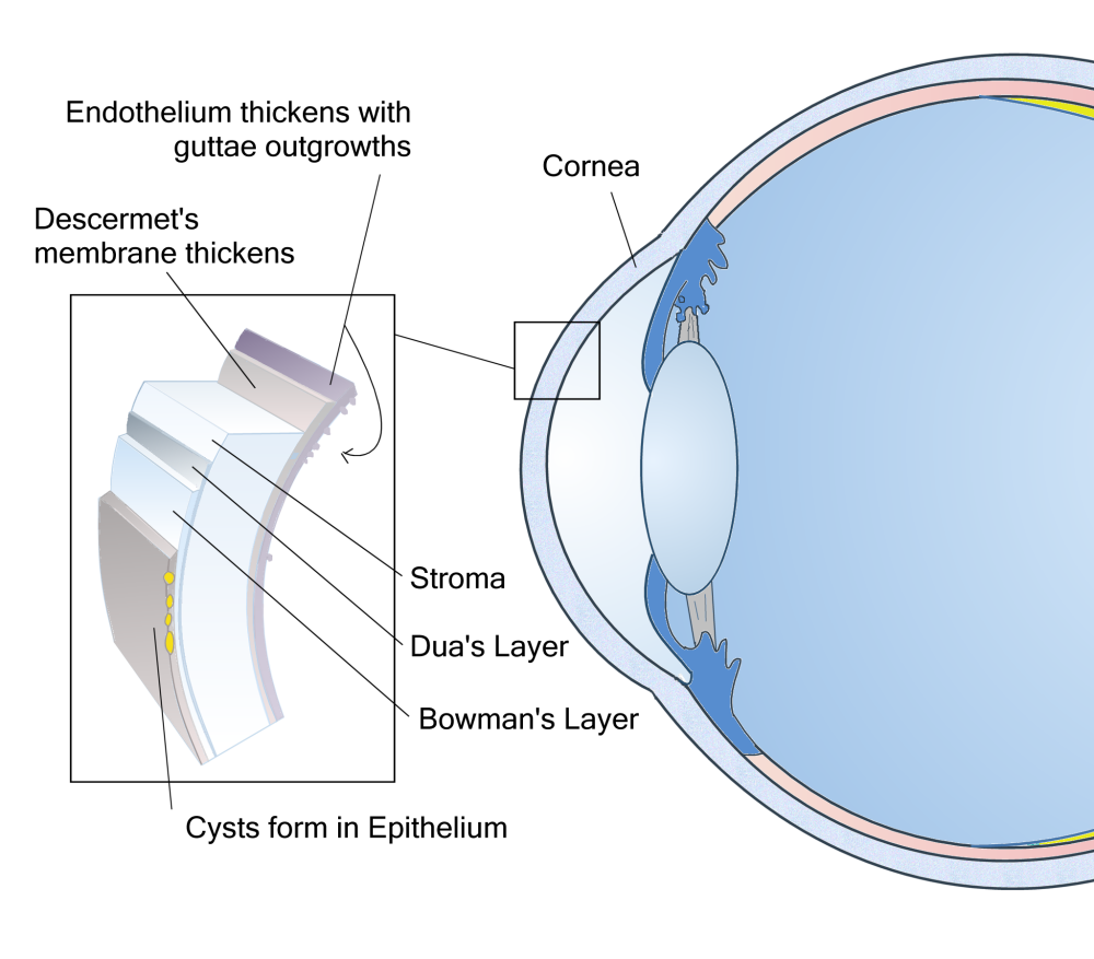 台北慈濟醫院眼科沈姵妤醫師表示,角膜需要有良好的透明度及曲度才能讓光完美的聚焦在視網膜上,形成清晰的影像。「角膜內皮細胞失養症」導致角膜水腫以致於角膜透明度不佳,可透過裂隙燈、角膜厚度分析儀、角膜內皮細胞分析儀檢查角膜功能是否正常,倘若不治療視力會逐漸模糊,所以需要接受角膜移植才能恢復視力。通常較少在兒童或青壯年時期發病,而是在中壯年後才漸漸出現視力減退、光暈感及疼痛等症狀,好發率約3.3%至9.2%,且多為女性。