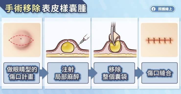 決定處理方式時,通常要先看表皮樣囊腫當時的狀況。假若並沒有發炎,那麼最直接、最完整的處理方式就是以手術完整切除。唯有手術切除,能完整移除整個囊袋。