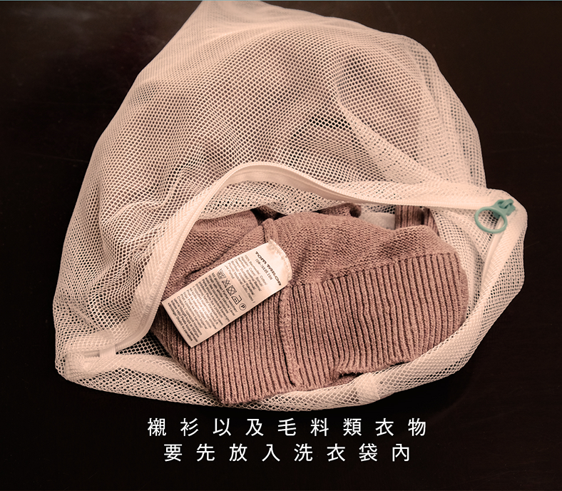 材質部分則將襯衫以及毛料類衣物(像是毛衣、燈芯絨衣物、容易起毛球衣物)放入洗衣袋內,避免把衣服洗壞。