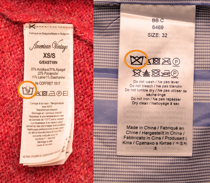 下圖左邊的P表示可以乾洗,底下的一條橫線代表要溫和乾洗,如有兩條橫線便要非常溫和乾洗;而圖中間的位圓形打叉即是不可乾洗;圖右的圓圈中有「W」表示為專業濕洗,下面加一條橫線表示溫和濕洗。