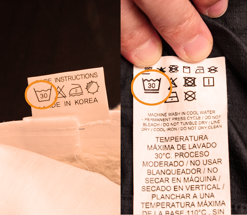 水盆內的數字代表最高的水溫,而水盆底的橫線代表要溫和處理。如果水盆底有兩條橫線,代表要「非常溫和處理」,要選用洗衣機較為輕柔的模式。