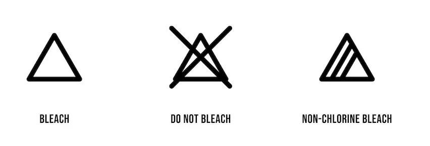 三角標誌與漂白水使用相關,分別為:可以使用漂白水、不可氯漂只能氧漂(氧漂較為溫和)、不可漂白。像是毛料、尼龍、人造絲等材質通常都不可漂白,因此漂白水使用前務必閱讀洗標,不要讓衣服洗壞!