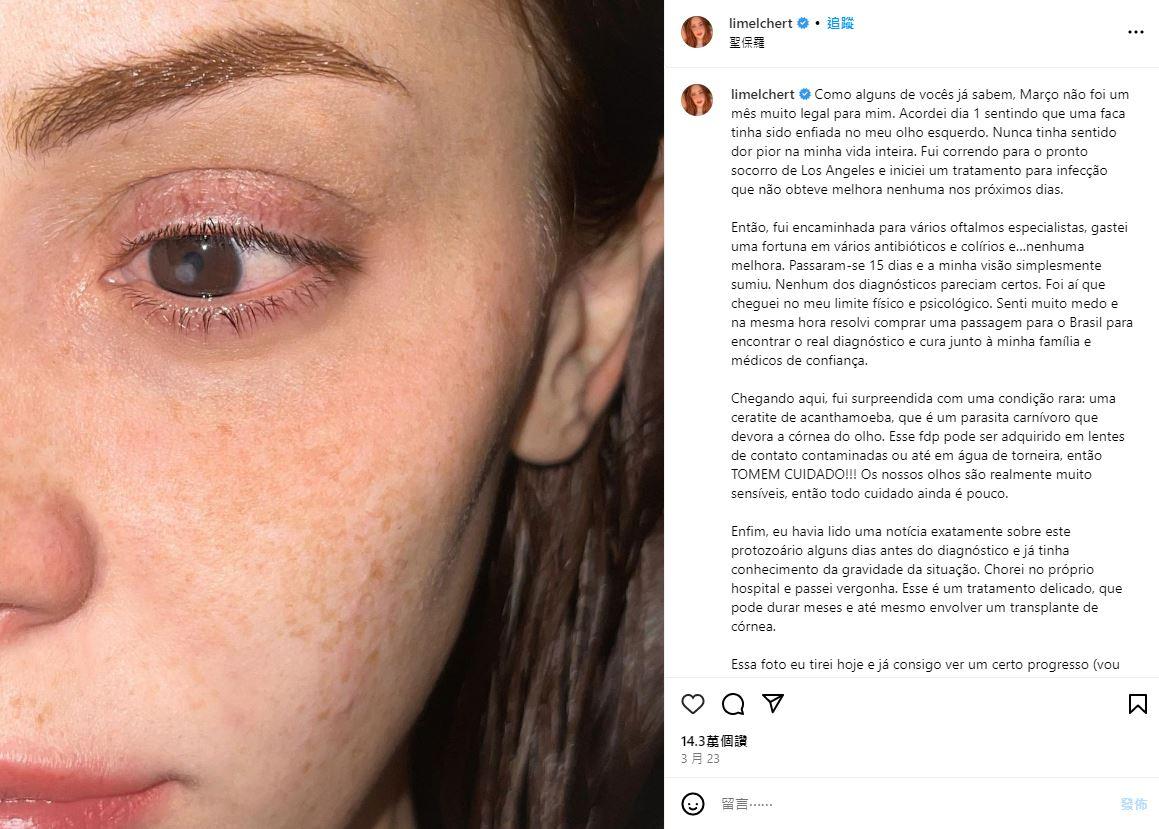 眼睛是人類的靈魂之窗,若是為了美觀而配戴受污染的隱形眼鏡,導致細菌感染造成永久的視力障礙,可謂得不償失。近日,在IG擁有150萬fans的KOL梅爾切特(Lilian Melchert)在網路表示,自己因為眼睛疼痛而就醫,意外發現感染棘阿米巴角膜炎(Acanthamoeba keratitis),即使接受治療也無法百分之百獲得改善,還一度喪失視力,讓她感到非常崩潰。