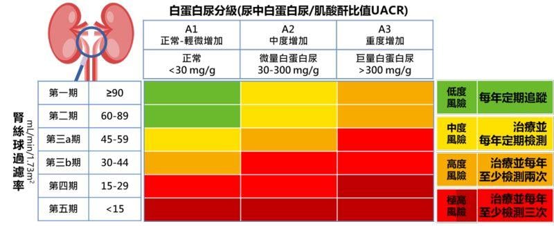 若發現數值異常,可依據低風險的綠燈到極高風險的紅燈,與醫師討論並安排對應的腎功能追蹤與治療方案。