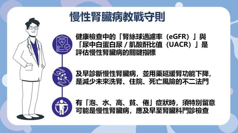 蔡尚峰醫師指出,民眾若發現健檢報告中的「腎絲球過濾率(eGFR)」與「尿中白蛋白尿/肌酸酐比值(UACR)」數值異常,應與腎臟科醫師討論合適的腎功能追蹤與治療方案。