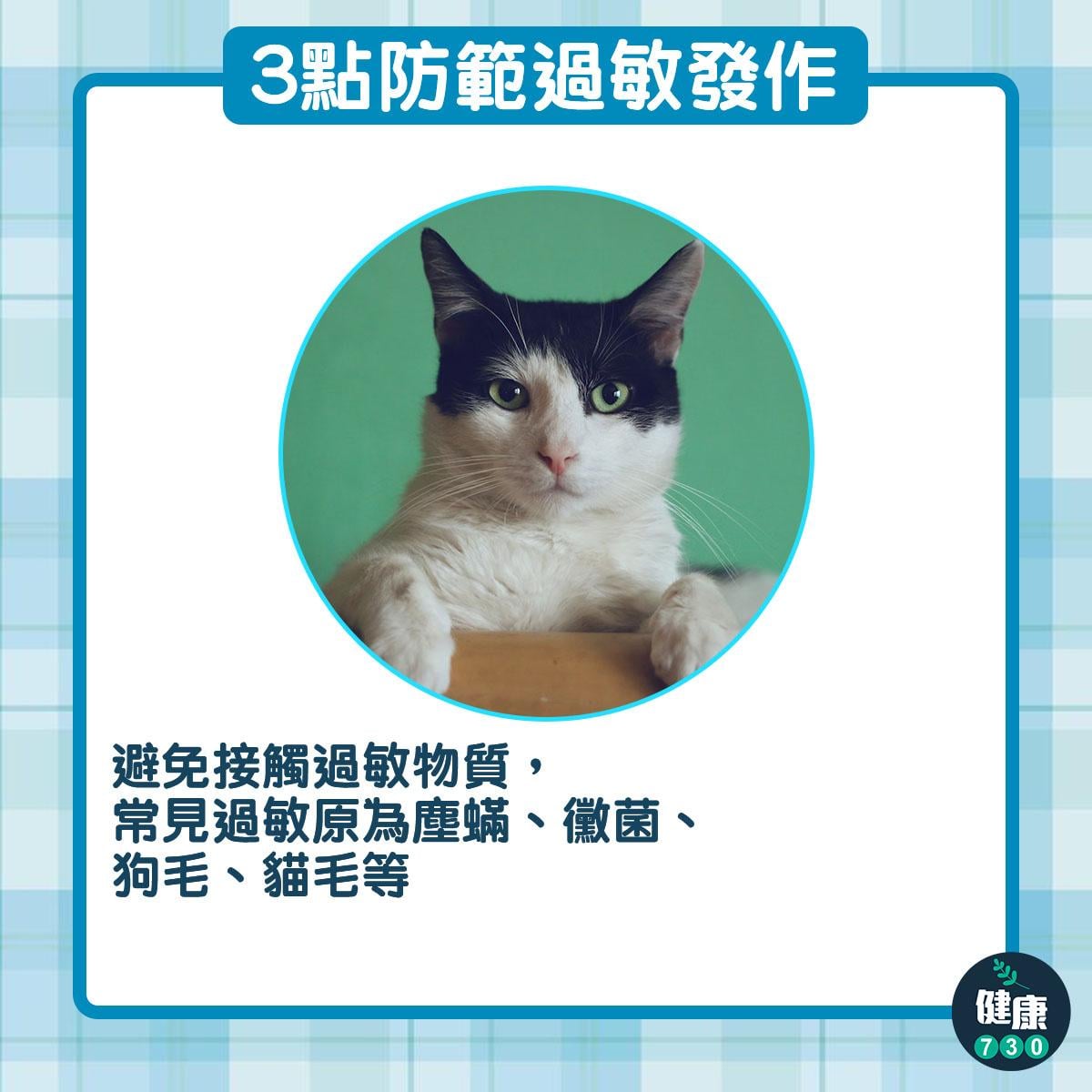 - 避免接觸過敏物質,常見過敏原為塵蟎、黴菌、狗毛、貓毛等。