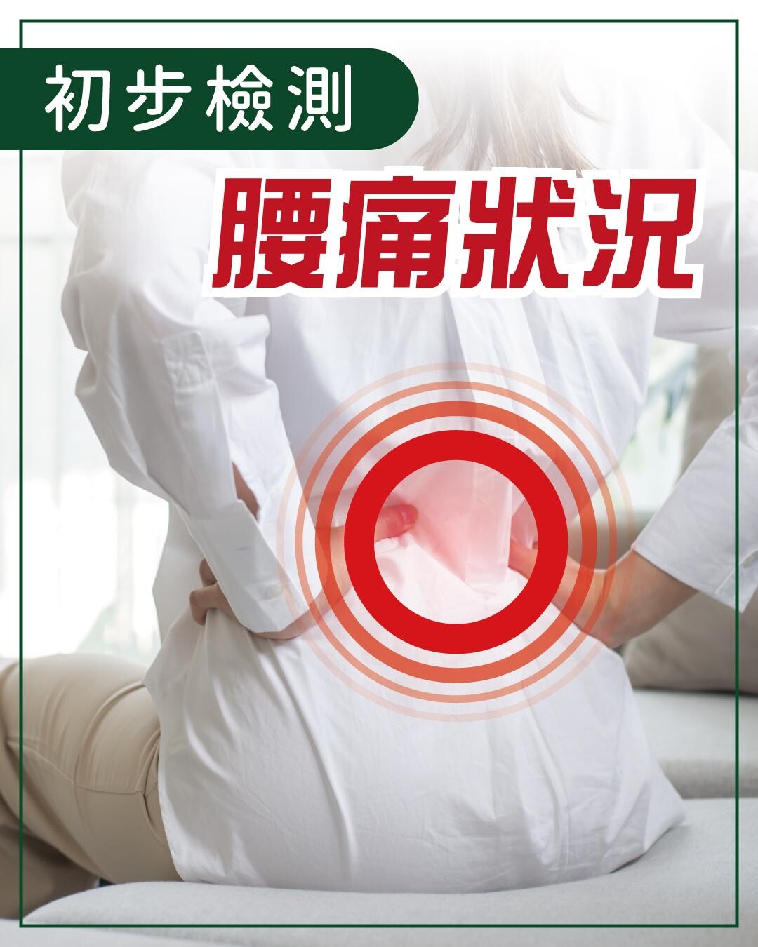 當腰痛問題持續一段時間,會影響工作及心理,為幫助大家了解自身的腰痛問題,可跟著以下動作做,初步檢測自己痛症或關節筋骨痛問題的狀況。