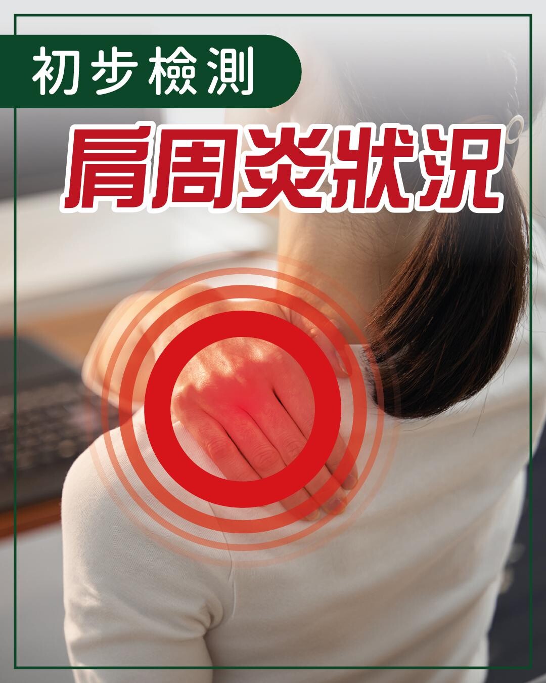 有肩周炎置諸不理,可以嚴重影響生活及工作,因此應及早發現問題,並積極解決。若懷疑自己有肩周炎可做以下初步檢測。
