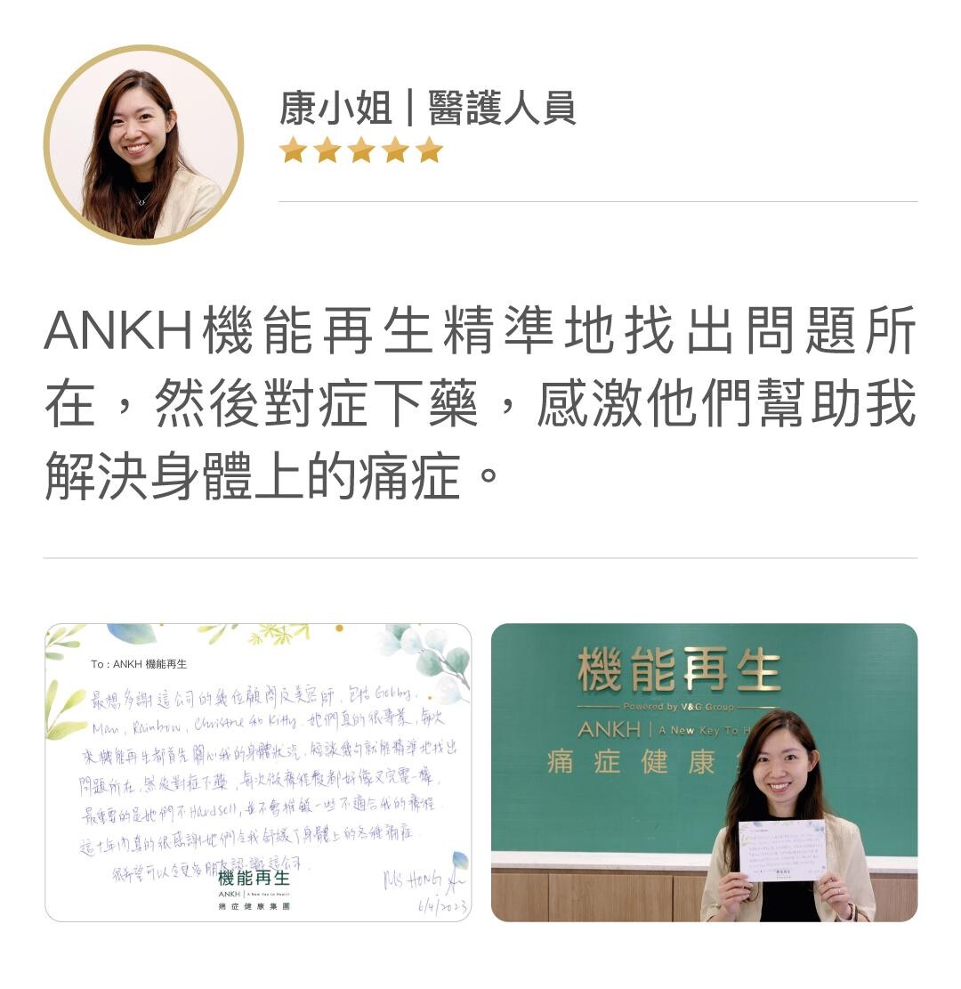 康小姐非常感謝 ANKH機能再生幫助她解決痛症及強化身體機能,並表示:「而家新陳代謝好咗,成個人冇咁繃緊,終於可以一覺瞓天光。」