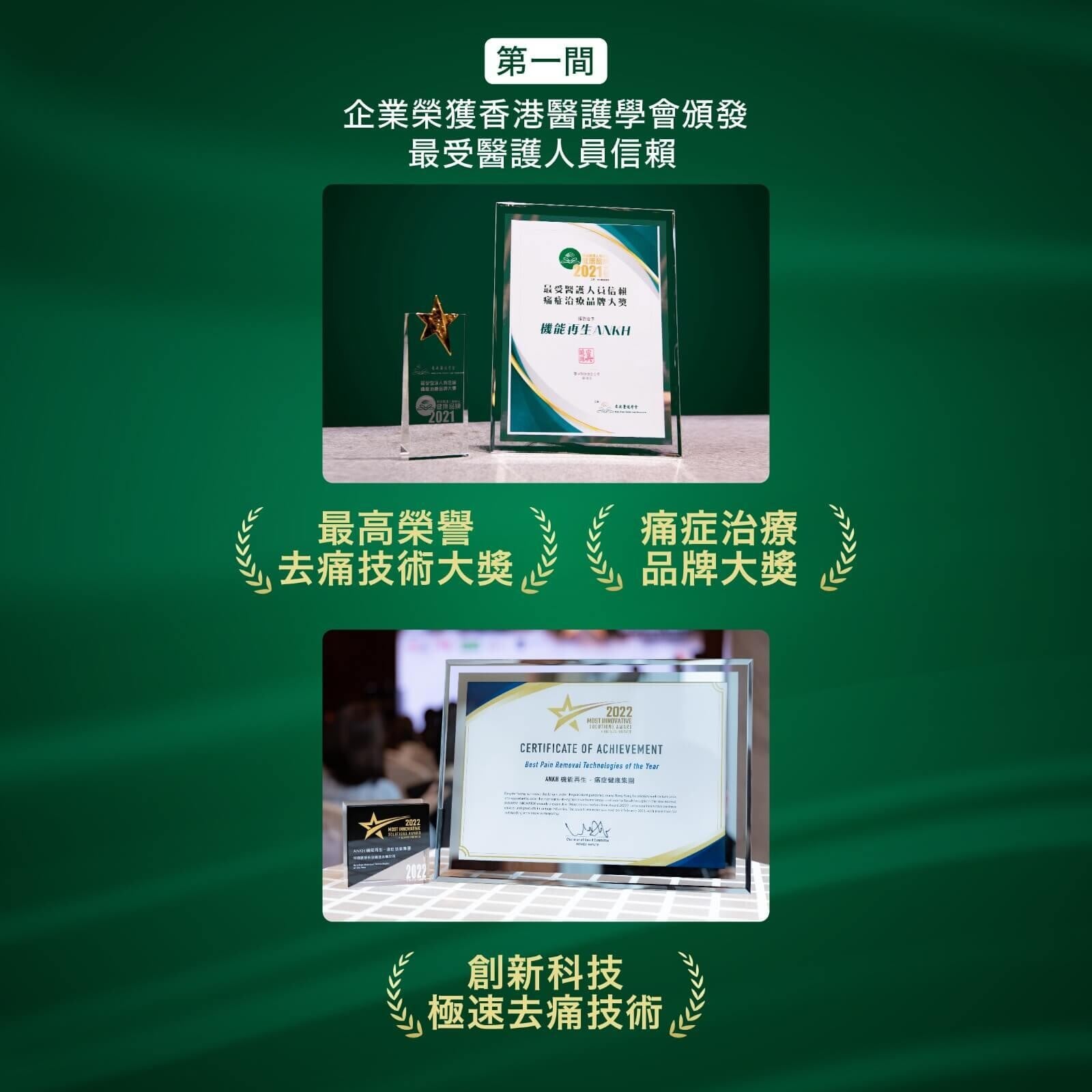 ANKH機能再生 - 痛症健康集團深受各方專業信任,不但已經連續兩屆獲得香港醫護學會認同及肯定,更分別奪得最受醫護人員信賴「痛症治療品牌大獎」以及「最高榮譽去痛技術大獎」,深得醫護人員信賴及推崇。