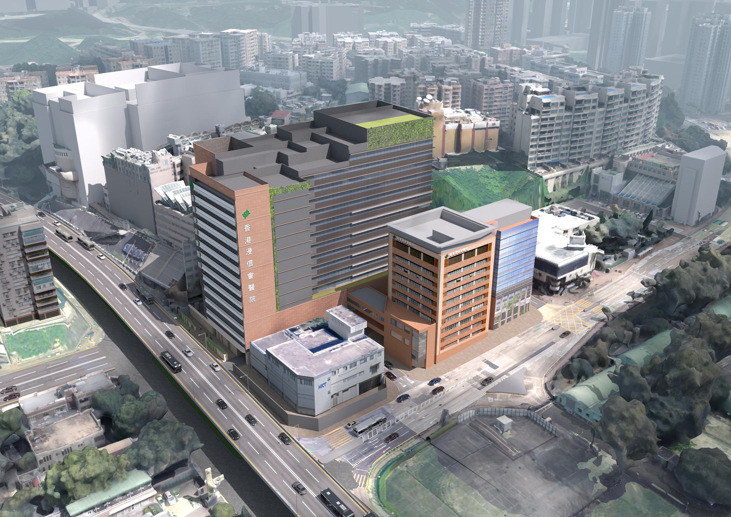 浸會醫院舊院A、B、C座將於2033年整合成一座綜合醫院大樓。(模擬圖)