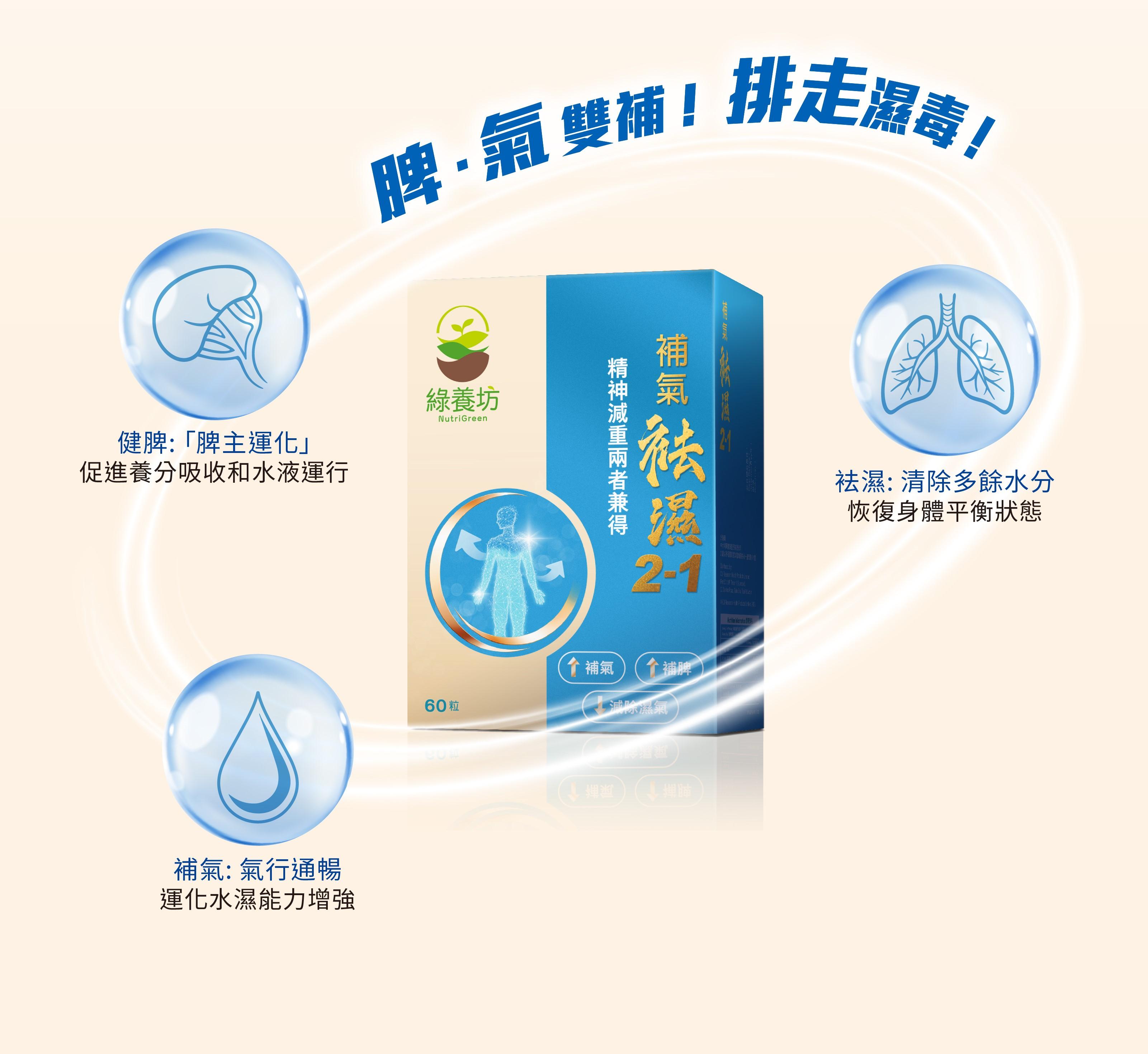 「綠養坊補氣祛濕2-1」精選多種天然中草本,配合獨有人參成分,加入茯苓、 黃芪、 薏苡仁、白朮、薑皮、桑白皮及竹芋等,能健脾補氣, 更可利腸排毒,加速身體水份循環,排走體內多餘濕邪毒素。針對濕熱、痰濕、濕重等體質,而且配方性質溫和,由大學專家科研,適合香港男女體質服用,幫你回復元氣,精神爽利,養成無濕體質!