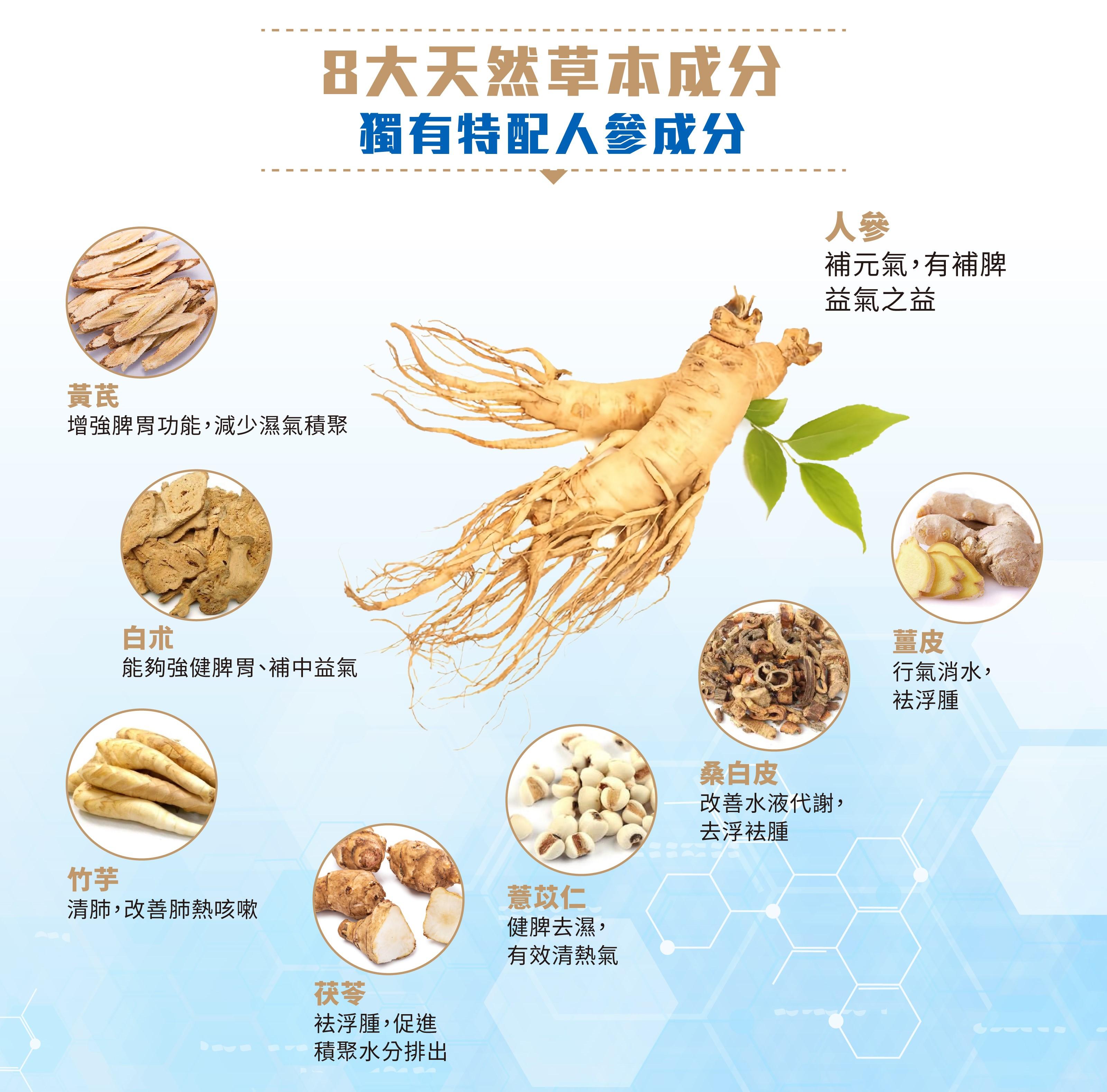 • 人參:有「百草之王」之稱,補五臟、益元氣,強化脾胃功能。