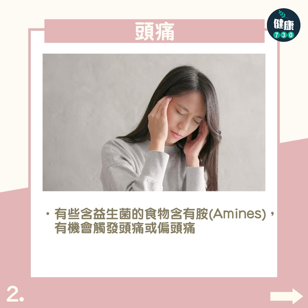 益生菌副作用|如果身體出現以上反應,可先降低進食劑量。如果情況維持超過數星期,則建議暫時進食含益生菌的食物,並諮詢醫生意見。 益生菌副作用|消化系統不適:部份人進食益生菌補充品後,會出現短暫性腹脹、便秘,或增加口渴感 益生菌副作用|過敏現象:益生菌可在消化道製造組織胺,有機會觸發痕癢、呼吸困難等過敏現象 益生菌副作用|增加感染風險:當益生菌中的細菌進入血液,有機會導致感染,特別是免疫力較差、長期病患或接受過手術的人士,但這個情況較罕見 益生菌副作用|頭痛:有些含益生菌的食物含有胺(Amines),有機會觸發頭痛或偏頭痛