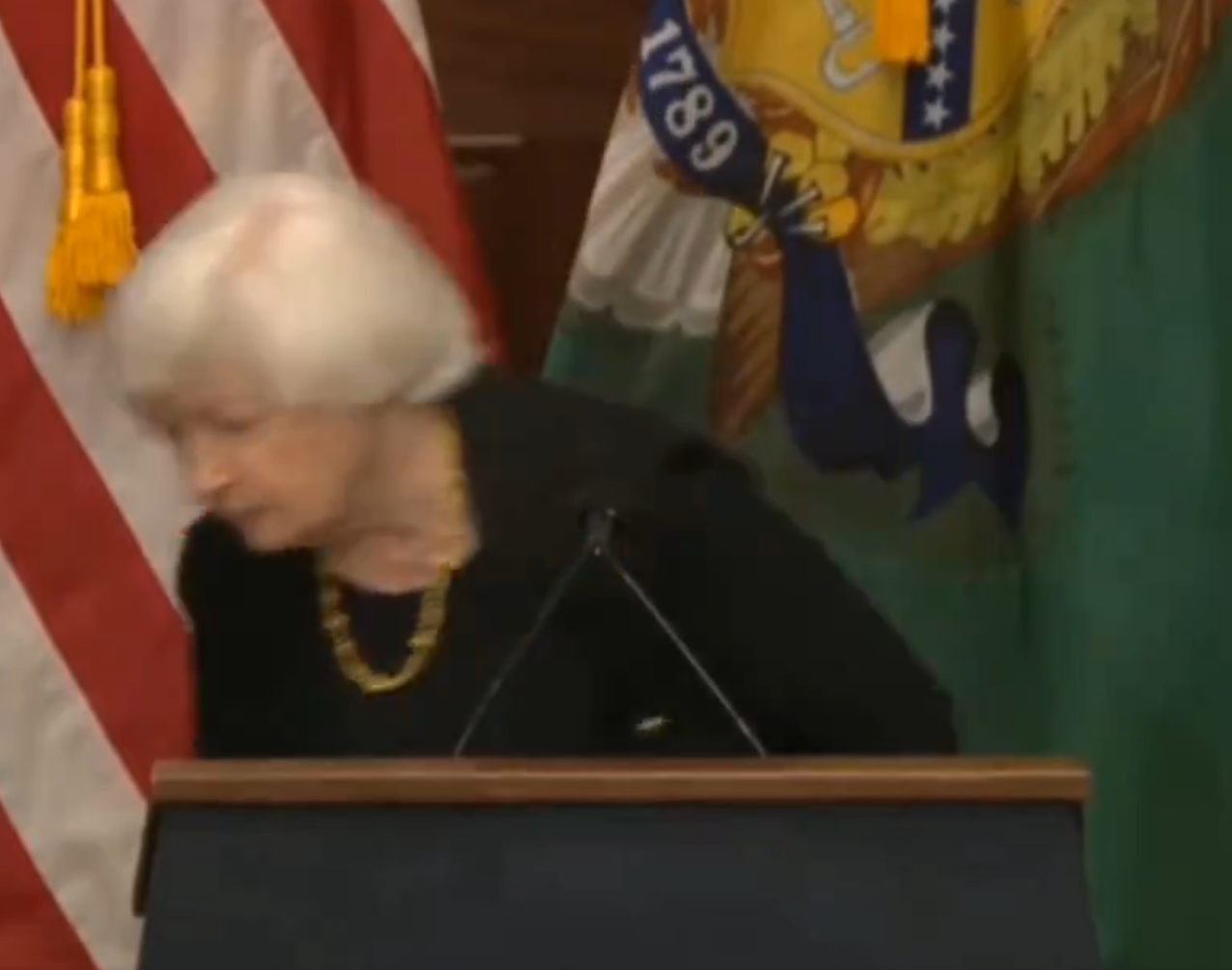 國際貨幣基金組織和世界銀行年日前在美國華盛頓召開之際,美國財長耶倫上周二(22日)在一場記者會發表講話的一幕,近日在網上瘋傳。