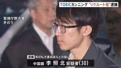 中國人涉嫌在日本,利用代考及試場內作弊方式,通過英語TOEIC考試的案件。日本警察拘捕一名涉嫌主使的中國人李照北,他被指招攬代考者以及指示執行代考的中國留學生作弊。