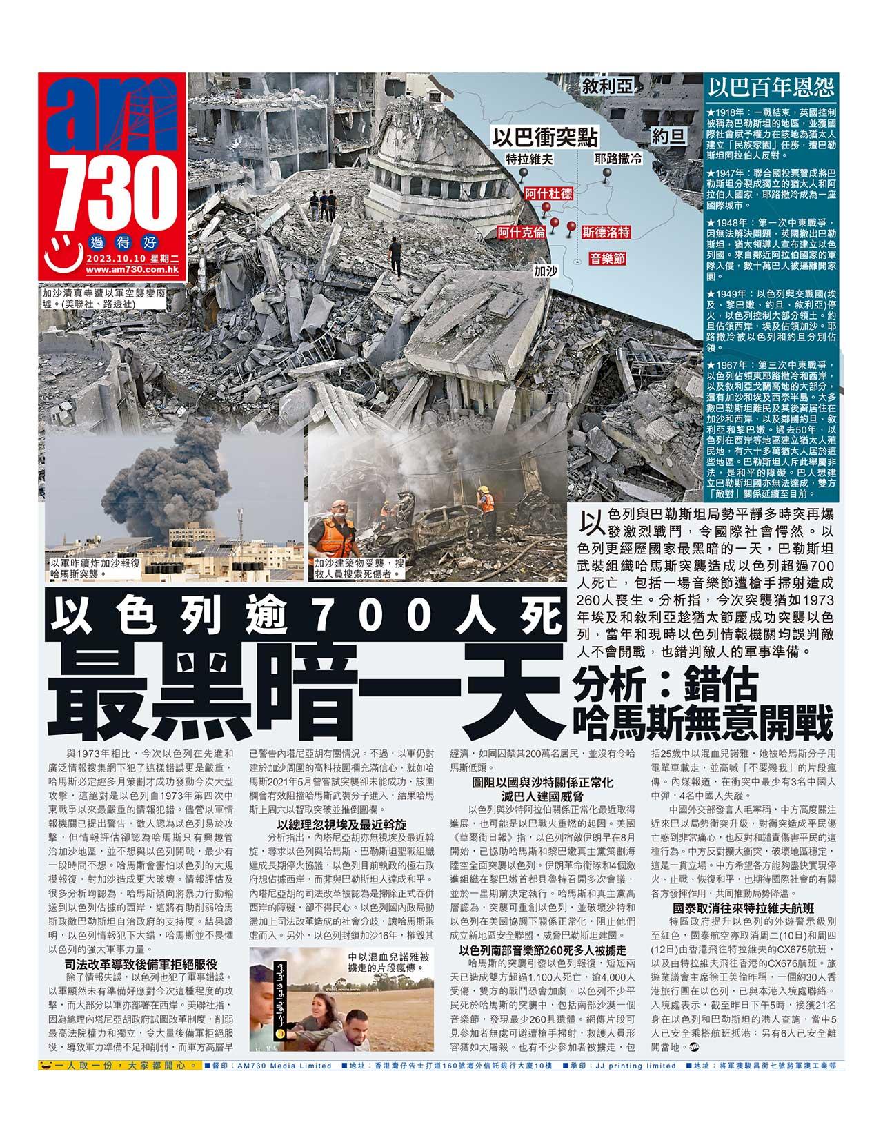 以色列與巴勒斯坦局勢平靜多時突再爆發激烈戰鬥,令國際社會愕然。以色列更經歷國家最黑暗的一天,巴勒斯坦武裝組織哈馬斯突襲造成以色列超過700人死亡,包括一場音樂節遭槍手掃射造成260人喪生。分析指,今次突襲猶如1973年埃及和敘利亞趁猶太節慶成功突襲以色列,當年和現時以色列情報機關均誤判敵人不會開戰,也錯判敵人的軍事準備。