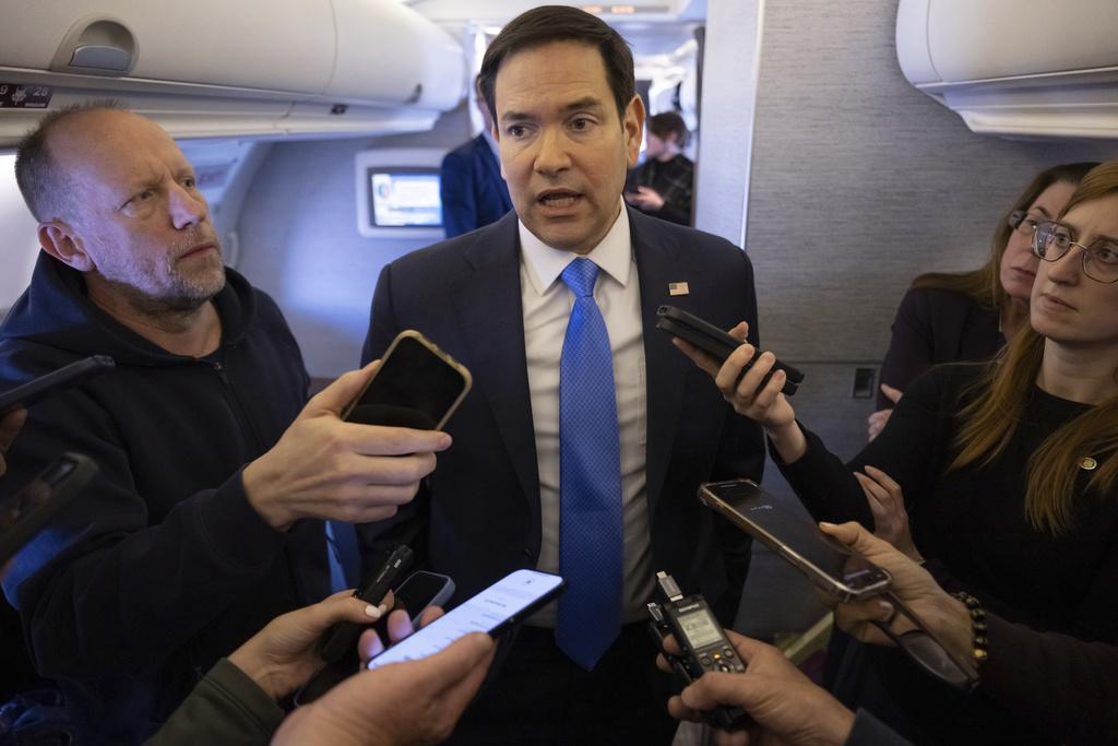 魯比奧在飛往沙特的專機上受訪。(美聯社)